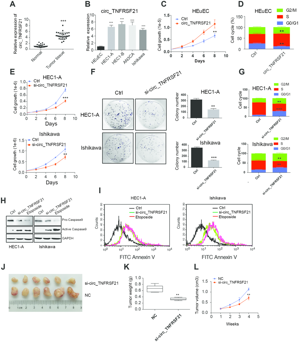 To further understand the roles of circTNFRSF21 in EC. circTNFRSF21 expression in EC patients, EC cell lines HEC1-A, HEC1-B, AN3CA, Ishikawa and normal human endometrial epithelial cells HEuEC were examined. As expected, circTNFRSF21 was greatly upregulated in both EC tumor tissues and EC cell lines compared with their adjacent normal tissues or normal HEuEC cells (Figure 3A, 3B **P<0.01, ***P<0.001). Due to the slightly different expression level of circTNFRSF21among all the four EC cell lines, we randomly selected HEC1-A and Ishikawa for further study. We first tested if highly expressed circTNFRSF21 in EC cells were linked to rapid cell growth. circTNFRSF21 overexpressing plasmid was transfected into HEuEC cells, cell growth and cell cycle were evaluated. Interestingly, overexpressing circTNFRSF21 greatly increased HEuEC cell growth (Figure 3C, **P<0.01), and promoted HEuEC cells transition from G0/G1 to S phage (Figure 3D, **P<0.01). However, knocking down circTNFRSF21 significantly decreased EC cell growth, colony formation, cell cycle progression and increased EC cell apoptosis (Figure 3E–3I, **P<0.01, ***P<0.001).