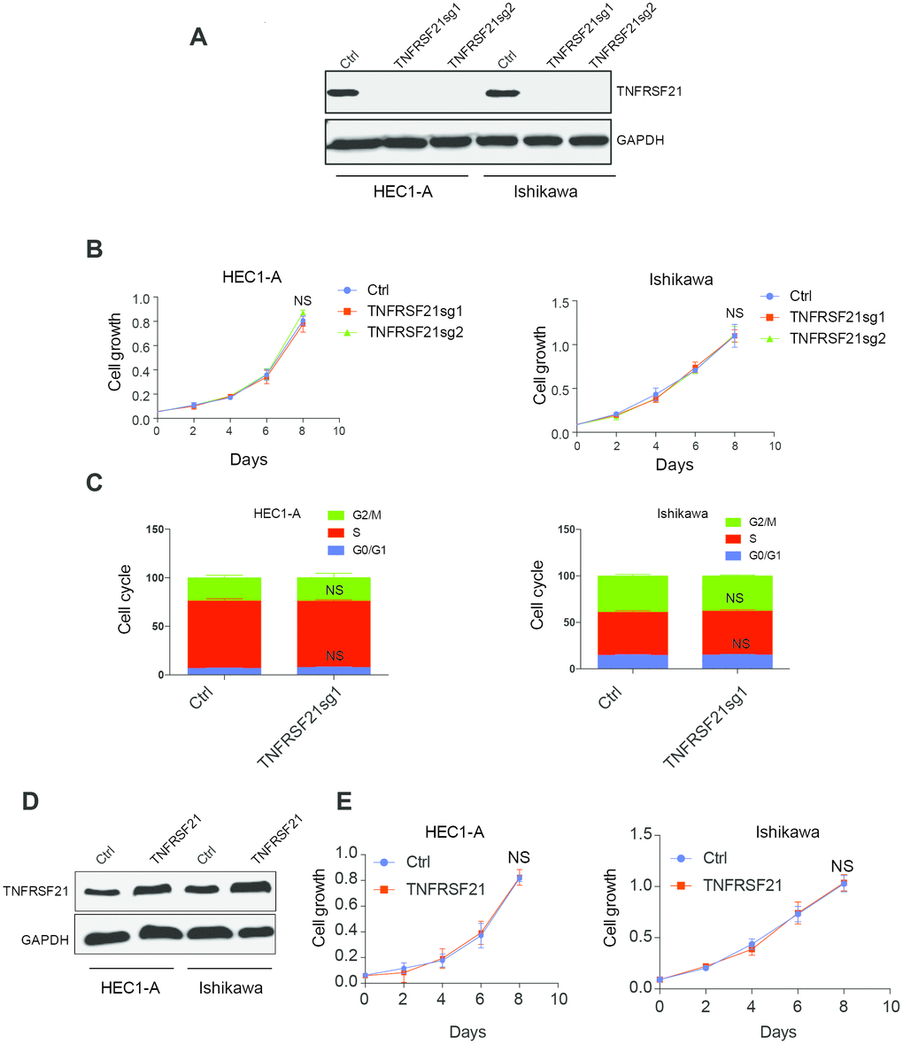 circTNFRSF21 downregulates TNFRSF21 mRNA transcription and protein expression. We next asked if circTNFRSF21 promotes EC cell growth through downregulating TNFRSF21. CRISPR was used to knock out TNFRSF21 in HEC1-A and Ishikawa cells in which Cas9 were stably expressed. TNFRSF21 was efficiently knocked out by Cas9 (Figure 4A). However, cell growth and cell cycle were unaffected even though TNFRSF21 protein level was heavily impaired (Figure 4B, 4C). In line with this, TNFRSF21 overexpression does not affect EC cell growth (Figure 4D, 4E). These results indicated that circTNFRSF21 promotes EC cell growth is not mediated through downregulating TNFRSF21.