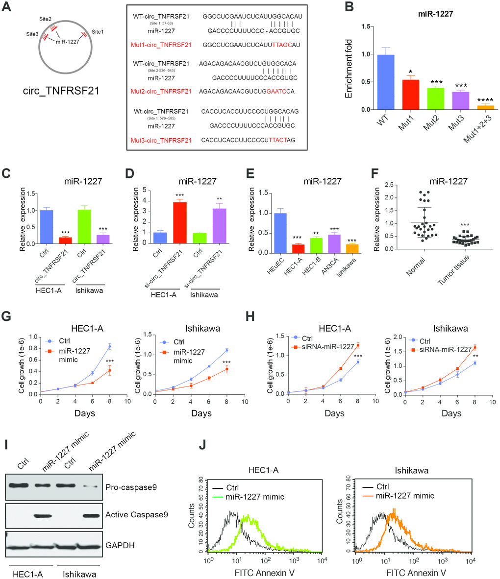 Many studies suggested that circRNA could function as miRNA sponge and regulate miRNA expression [18]. Therefore, we hypothesis that circTNFRSF21 promotes EC cell growth might through working as miRNA sponge. Circular RNA database circinteractome was used to find potential circTNFRSF21-miRNA interactions. Results showed that miR-1227 which has 3 binding sites on circTNFRSF21 is a potential target of circTNFRSF21. The potential miR-1227 binding sites and sequences on circTNFRSF21 were shown in Figure 5A. To confirm miR-1227- circTNFRSF21 interaction is indeed exist within cells, WT circTNFRSF21 or miR-1227 binding sites mutated circTNFRSF21 were labeled with biotin and used for RNA pull down. As indicated, mutating either of these three miR-1227 binding sites significantly decreased circTNFRSF21-miR-1227 interaction. Moreover, the circTNFRSF21-miR-1227 interaction was almost completely abolished when all the three miR-1227 binding sites were mutated. (Figure 5B, *P<0.05, ***P<0.001, ****P<0.0001). We next asked if circTNFRSF21 could affect miR-1227 expression. circTNFRSF21 expressing vector or siRNA vector targeting circTNFRSF21 were exogenously introduced into EC cell lines HEC1-A and Ishikawa, qRT-PCR was then used to detect miR-1227 expression. Results showed that overexpression of circTNFRSF21 significantly decreased miR-1227 expression (Figure 5C, ***P<0.001), while knock down of circTNFRSF21 recovered miR-1227 level in both HEC1-A and Ishikawa cells (Figure 5D, **P<0.01, ***P<0.001).