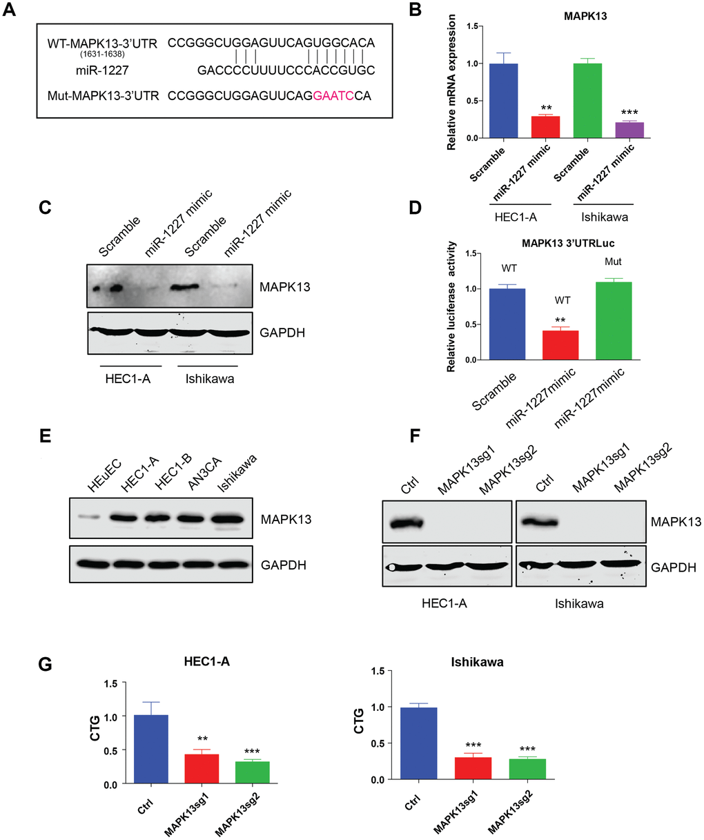 The most studied roles of miRNA were to impair mRNA stability and further affect protein synthesis. Bioinformatic analysis was then applied to predict miR-1227 targets. Interestingly, MAPK13, a member of the mitogen-activated protein (MAP) kinase family was indicated a potential target of miR-1227. The binding sites of miR-1227 on MAPK13 3’UTR was shown (Figure 6A). To verify MAPK13 is the target of miR-1227 in EC cells, miR-1227 mimic or scramble control was introduced into HEC1-A and Ishikawa cells, the expression of MAPK13 was then tested. Results showed that miR-1227 mimic heavily impaired MAPK13 transcription and protein synthesis, as shown by decreased mRNA and protein level in the presence of miR-1227 mimic (Figure 6B, 6C, **P<0.01, ***P<0.001). In addition, when transfecting miR-1227 mimic and luciferase vector containing wild type or miR-1227 binding sites mutated MAPK13 3’UTR into cells, miR-1227 significantly suppressed WT MAPK13 3’UTR activity with no effect on mutated MAPK13 3’UTR activity (Figure 6D, **P<0.01). These results strongly suggested that MAPK13 is the target of miR-1227 in EC cells. Previous studies on cancer stem-like cells (CSCs) discovered that knock down of MAPK13 greatly abrogated CSCs tumor-initiating ability [19], indicating that MAPK13 might play a role in tumor progression. The roles of MAPK13 in EC cell growth was then investigated. Results suggested that MAPK13 expression was at a higher level in EC cell lines than HEuEC (Figure 6E). CRISPR-Cas9 was used to knock down MAPK13 in HEC1-A and Ishikawa cells in which Cas9 were stably expressed, cell growth was then tested. As indicated, sgRNAs targeting MAPK13 efficiently knocked down MAPK13 (Figure 6F), cell growth was also significantly decreased in the absence of MAPK13 in both HEC1-A and Ishikawa cells (Figure 6G, **P<0.01, ***P<0.001).