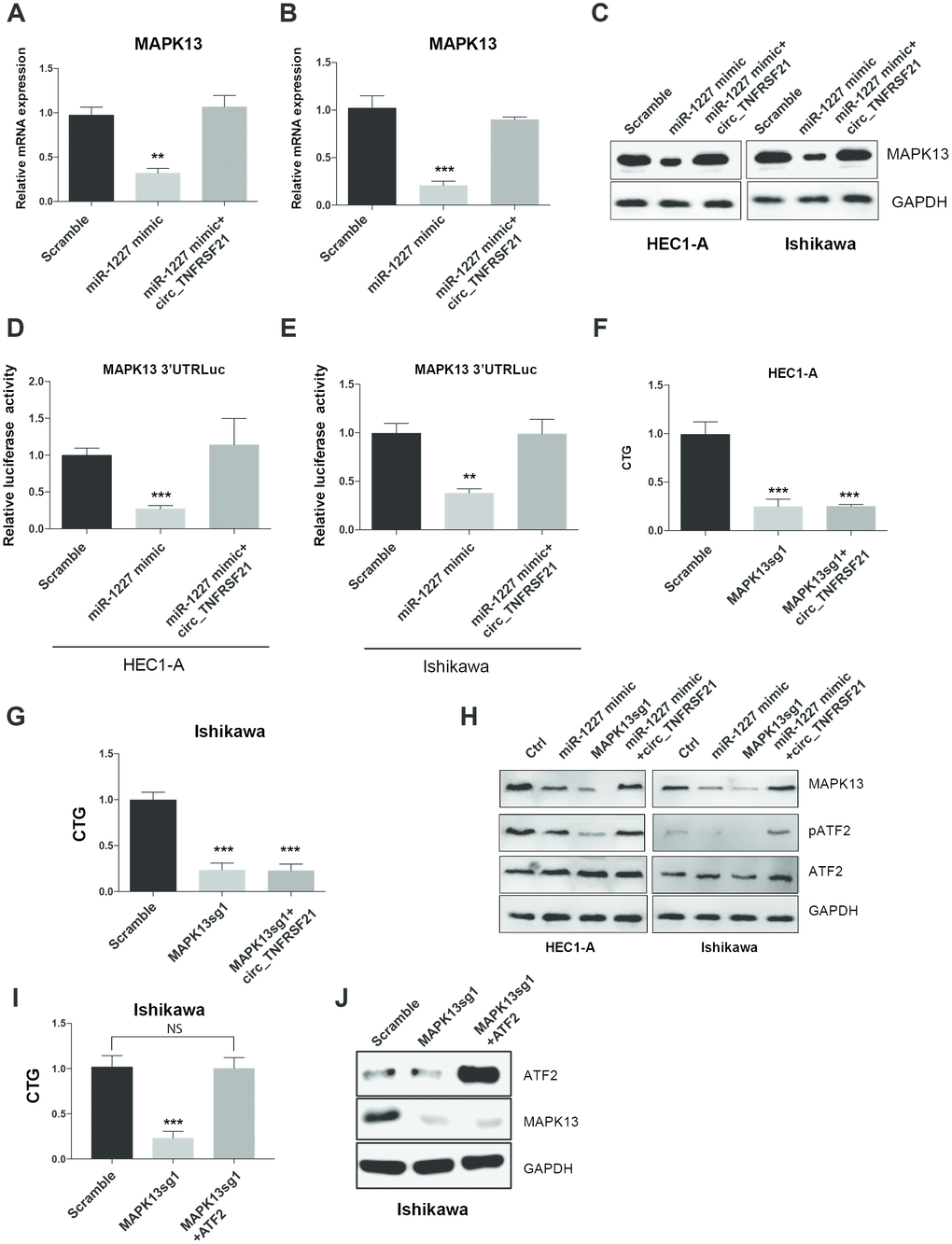 As miR-1227 sponge, we next asked if circTNFRSF21 could rescue MAPK13 expression impaired by miR-1227. HEC1-A and Ishikawa cells were transfected with miR-1227 in the presence or absence of circTNFRSF21. As expected, miR-1227 greatly downregulated MAPK13 transcription and protein level in both HEC1-A and Ishikawa cells, while presence of circTNFRSF21 almost completely rescued MAPK13 expression (Figure 7A–7C, **P<0.01, ***P<0.001). Luciferase assay with MAPK13 3’UTR showed that circTNFRSF21 restored MAPK13 3’UTR activity suppressed by miR-1227 (Figure 7D, 7E, **P<0.01, ***P<0.001). To find out if MAPK13 is the downstream driver gene for EC cell growth, CRISPR-Cas9 was used to delete MAPK13 in the presence or absence of circTNFRSF21, cell growth was measured 5 days after transfection. Results showed that circTNFRSF21 could not rescue HEC1-A and Ishikawa cell growth after deleting MAPK13 (Figure 7F, 7G, ***P<0.001), indicating MAPK13 is the downstream gene regulated by circTNFRSF21. As a protein kinase, MAPK13 phosphorylate ATF2 is important for cell growth and proliferation. The roles of circTNFRSF21 in MAPK13-ATF2 signaling pathway was also investigated. Indeed, knock down of MAPK13 or over-expressing miR-1227 greatly downregulated MAPK13 expression and phosphorylated form of ATF2 (pATF2), while, circTNFRSF21 rescued MAPK13 and pATF2 expression impaired by miR-1227 (Figure 7H). To further confirm ATF2 is the downstream gene regulated by MAPK13. ATF2 was introduced into EC cells followed by MAPK13 knockout. As expected, MAPK13 knockout greatly decreased EC cells growth. However, ATF2 restored EC cell growth impaired by MAPK13 knockout (Figure 7I–7J), These results further confirmed that ATF2 is the downstream gene regulated by MAPK13 in EC cells.