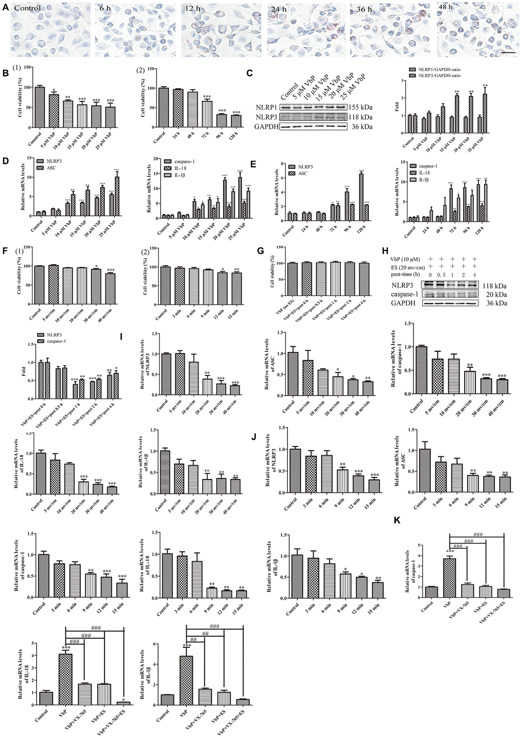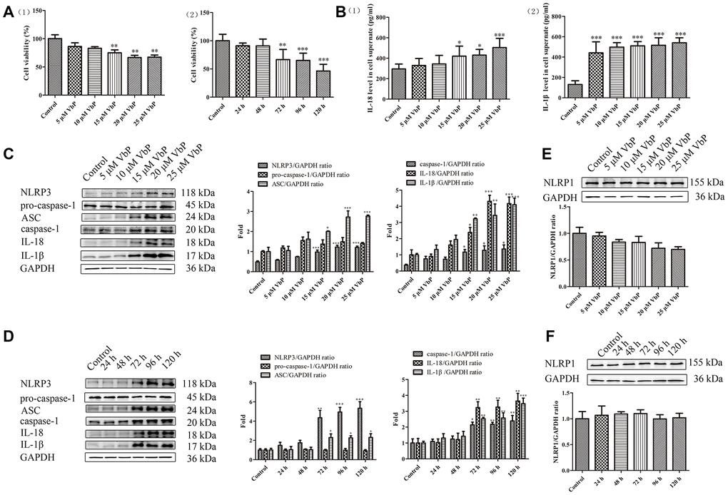To determine the optimal pyroptosis induction conditions, cell viability was analyzed in VbP -treated, PMA-differentiated THP-1 macrophages using the CCK-8 assay. Dose- and time-response experiments showed that over a 72 h incubation time, cell viability was reduced significantly at VbP concentrations ≥15 μM (Figure 1A(1)). In turn, when 15 μM VbP were applied, cell survival decreased significantly at incubation times ≥72 h (Figure 1A(2)). Meanwhile, after incubation with 15 μM VbP for 72 h, ELISA results showed that IL-18 and IL-1β levels in cell culture supernatants increased significantly (Figure 1B). In parallel, western blot results from similar dose-response (Figure 1C) and time-response (Figure 1D) studies showed that 15 μM VbP exposure for 72 h induced a significant increase in the expression of NLRP3, ASC (a scaffold protein that links NLRP3 and pro-caspase-1 [33]), caspase-1, IL-18, and IL-1β. We also confirmed that the expression of NOD-like receptor family protein 1 (NLRP1), another inflammasome complex also involved in pyroptosis, did not change significantly under the above conditions (Figure 1E and 1F). Therefore, in subsequent experiments pyroptosis was elicited in THP-1 macrophages by applying 15 μM VbP during a 72 h exposure time.