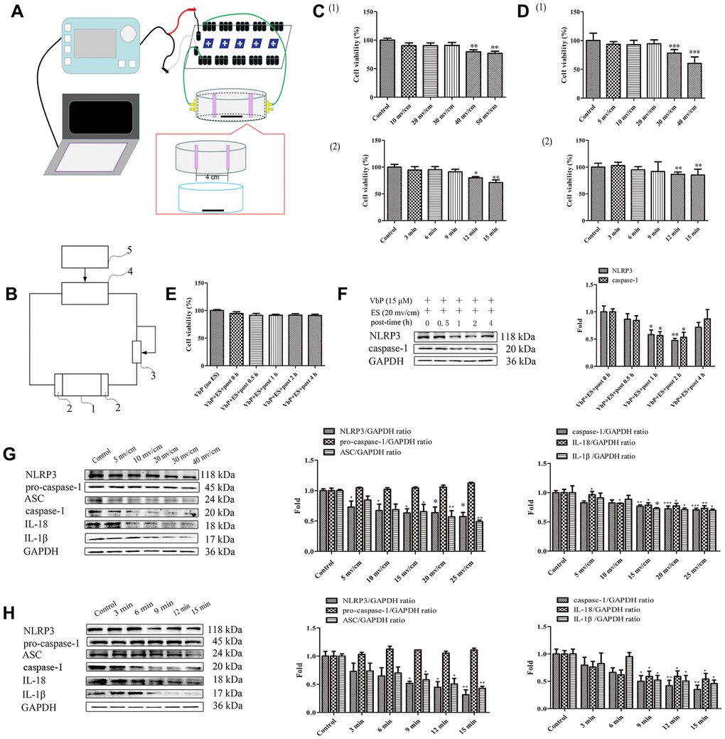 Figure 2A shows the modules and Figure 2B the circuit diagram of the ES device. Optimal ES parameters (i.e. voltage and treatment times) were selected by running cell viability assays to ensure that ES treatment per se did not compromise cell survival. The data showed that the survival rate of untreated THP-1 macrophages decreased significantly when an ES ≥40 mv/cm was applied during 9 min (Figure 2C(1)). In subsequent time-response tests using 30 mv/cm ES, we determined that viability was significantly reduced in control cells when ES lasted ≥12 min (Figure 2C(2)). Similar experiments in macrophages treated with 15 μM VbP indicated that 20 mv/cm and 9 min exposure were the upper threshold limits above which cell viability decreased modestly (Figure 2D). To evaluate whether delayed cell death may occur after short-term ES, viability was examined in VbP-treated macrophages between 0 and 4 h following ES. Results showed that cell viability was unchanged up to 4 h after a 9 min, 20 mv/cm ES (Figure 2E). Meanwhile, western blot results indicated that the expression of pyroptosis associated NLRP3 and caspase-1 proteins in VbP-treated THP-1 macrophages declined significantly only after 1 to 2 h following a 9 min ES at 20 mv/cm (Figure 2F). Therefore, downstream analysis were performed after a resting period of 2 h (at 37 °C, 5% CO2) following ES. To conclude ES settings optimization, the influence of both voltage and ES exposure time on pyroptosis-related protein levels was evaluated by western blot. As shown in Figure 2G and 2H, an obvious decrease in all the proteins tested (except for pro-caspase 1) was evident in cells treated with VbP and then subjected to ES (9-min, 20 mv/cm). Accordingly, 20 mv/cm and 9 min exposure time were chosen as the optimal ES parameters to characterize the effects of ES on VbP-induced pyroptosis in THP-1 macrophages.