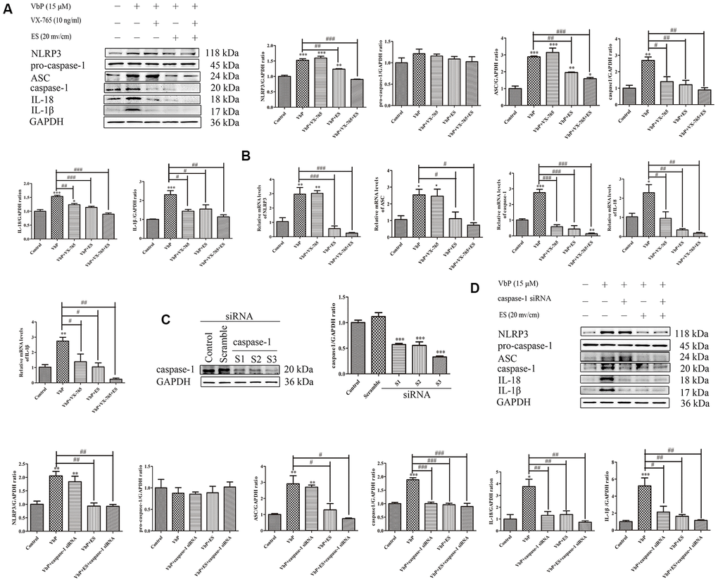 Subsequently, dose- and time-response experiments were conducted to assess the effect of ES on the viability of VbP-treated foam cells. Results showed that following 9-min exposure, modest but significant reductions in viability occurred at voltages ≥30 mv/cm, while at a fixed voltage of 20 mv/cm, viability was not affected during exposures lasting ≤9 min (Figure 8F). To evaluate whether delayed onset of cell death may occur during recovery from ES, CCK8 assays were performed in VbP-treated foam cells between 0 and 4 h following ES. No significant changes in cell viability were detected up to 4 h after 9 min ES at 20 mv/cm (Figure 8G). Meanwhile, under the same ES conditions western blot results indicated that the expression of the pyroptosis-associated proteins NLRP3 and caspase-1 began to decline 1 h post-ES (Figure 8H). Through further dose- and time-response experiments, RT-qPCR assays showed that 20 mv/cm and 9 min exposure were the lowest threshold settings causing significant reductions in NLRP3, ASC, caspase-1, IL-18, and IL-1β mRNA levels in VbP-treated foam cells (Figure 8I and 8J). Therefore, the above ES settings were found to be optimal to inhibit VbP-induced pyroptosis in THP-1 macrophage-derived foam cells. Applying these settings, RT-qPCR showed that caspase-1, IL-18, and IL-1β mRNA levels were dramatically increased by VbP, and greatly reduced by both co-treatment with VX-765 and subsequent ES (Figure 8K). These findings demonstrate that ES also inhibits VbP-mediated pyroptosis in foam cells.