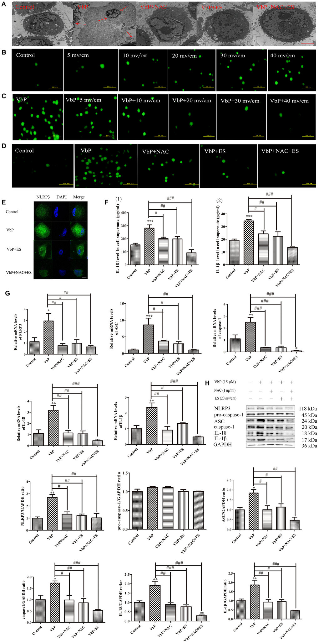 Research has shown that reactive oxygen species (ROS) facilitate activation of the NLRP3 inflammasome [35]. To assess ROS generation during VbP-induced pyroptosis, and whether ES counteracts this effect, N-acetylcysteine (NAC) was used to inhibit ROS production in THP-1 macrophages. Ultrastructural TEM analysis of VbP-treated cells showed that cell enlargement and nuclear shrinkage, i.e. two typical morphological changes in cells undergoing pyroptosis, were prevented by both co-application of NAC (1 mM) or subsequent ES, either alone or in combination (Figure 4A). As shown in Figure 4B, ROS production (assessed by 2-7-Dichlorofluorescin diacetate (DCFH-DA) staining) was stimulated in control THP-1 macrophages by raising the voltage on ES tests. Likewise, VbP exposure dramatically increased ROS production, although this effect was clearly reversed by subsequent exposure to ES (≥ 10 mv/cm) (Figure 4C) or concurrent NAC addition (Figure 4D). Besides, immunofluorescence results showed that VbP-induced NLRP3 expression decreased significantly after treatment with NAC, ES (20 mv/cm), or both (Figure 4E). Moreover, NAC exposure significantly attenuated IL-18 and IL-1β secretion (Figure 4F), and decreased the expression of pyroptosis-related mRNA transcripts (Figure 4G) and proteins (Figure 4H) in VbP-treated macrophages. These data indicate that VbP induces pyroptosis in THP-1 macrophages via ROS generation, which is effectively attenuated by ES.