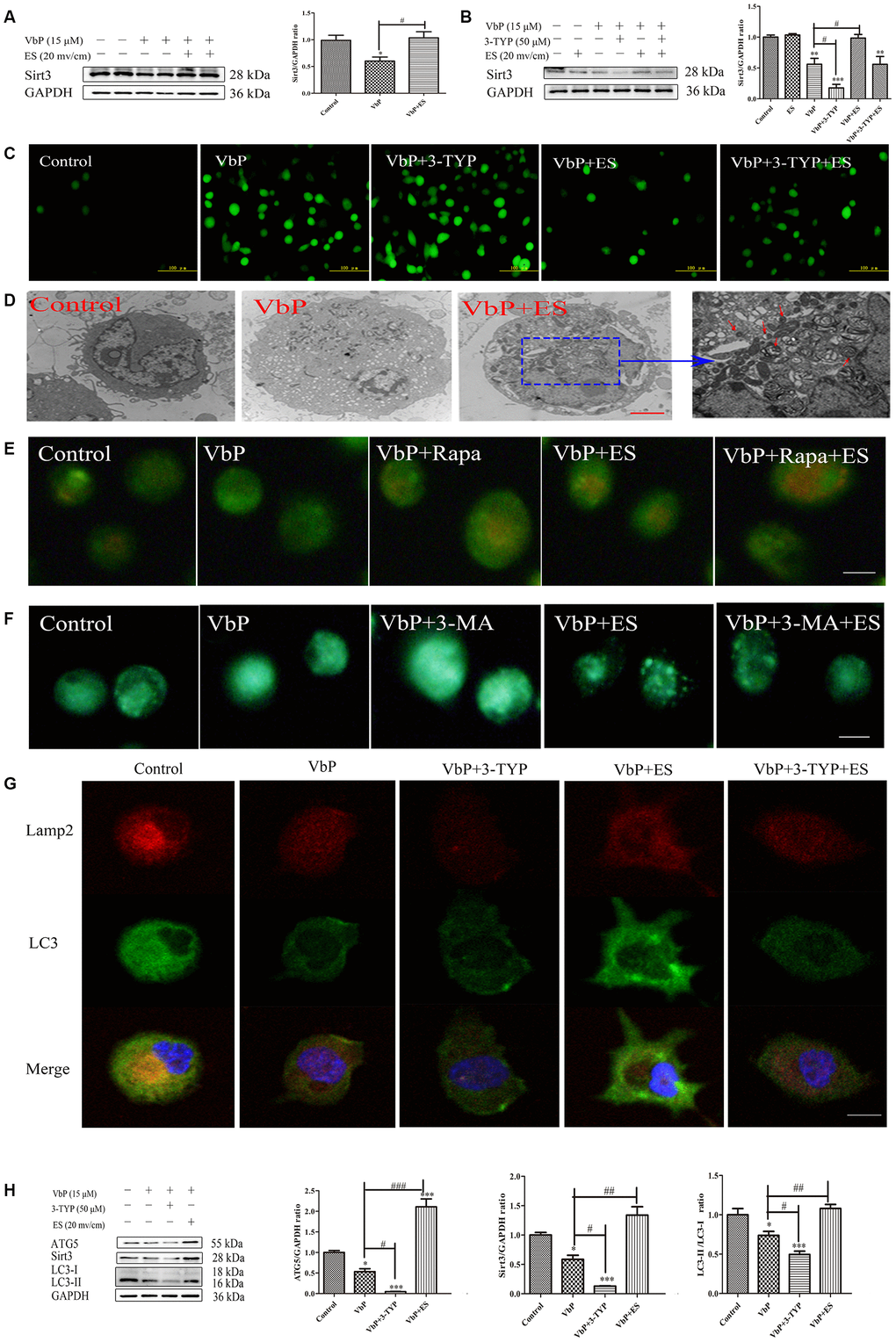 Most ROS production occurs in the mitochondria and is directly influenced by Sirt3, a NAD+-dependent deacetylase located mainly in this organelle. Since we showed that ES reduces VbP-induced ROS production in THP-1 macrophages, we asked whether Sirt3 upregulation may contribute to this effect. Western blots showed that Sirt3 levels decreased following VbP exposure, but fully recovered after subsequent ES (Figure 5A). ES had no effect on Sirt3 expression in untreated control cells, and pre-treatment with the Sirt3 inhibitor 3-TYP prevented ES-mediated Sirt3 upregulation in VbP-treated macrophages (Figure 5B). Meanwhile, DCFH-DA staining showed that 3-TYP exposure also attenuated the decrease in ROS levels mediated by ES in VbP-treated cells (Figure 5C). Since Sirt3 upregulation has been linked to induction of autophagy, we next assessed autophagosome formation by TEM [36]. This analysis revealed that ES promoted formation of autophagosomes with a distinct double membrane structure in VbP-treated macrophages (Figure 5D). Further evidence of active autophagy was provided by acridine orange (AO) staining, which indicated that ES also favored acidic vesicle organelles (AVOs) formation in those cells (Figure 5E). Meanwhile, monodansylcadaverine (MDC) staining showed diffuse labeling with minimal puncta in both control and VbP-treated cells. However, upon exposure of the latter to ES, numerous MDC-labeled autophagic vacuoles were evident, and this effect that was negated by pre-treatment with the autophagy inhibitor 3-methyladenine (3-MA) (Figure 5F). Further confirmation of Sirt3-mediated induction of autophagic fluxes following ES was obtained by evaluating autophagosome and autolysosome formation by immunofluorescence. Results showed that the expression of both microtubules associated protein 1 light chain 3-β (LC3), an autophagosome marker, and Lamp2, a marker of functional lysosomes, was decreased in VbP-treated macrophages, enhanced by subsequent ES, and abrogated by 3-TYP pre-treatment (Figure 5G). Furthermore, western blotting showed that the expression of LC3 and autophagy-related 5 (ATG5) was significantly increased by ES in VbP-treated cells, but decreased sharply after adding 3-TYP (Figure 5H). These findings indicate that pyroptosis inhibition by ES is linked to autophagy induction in macrophages.