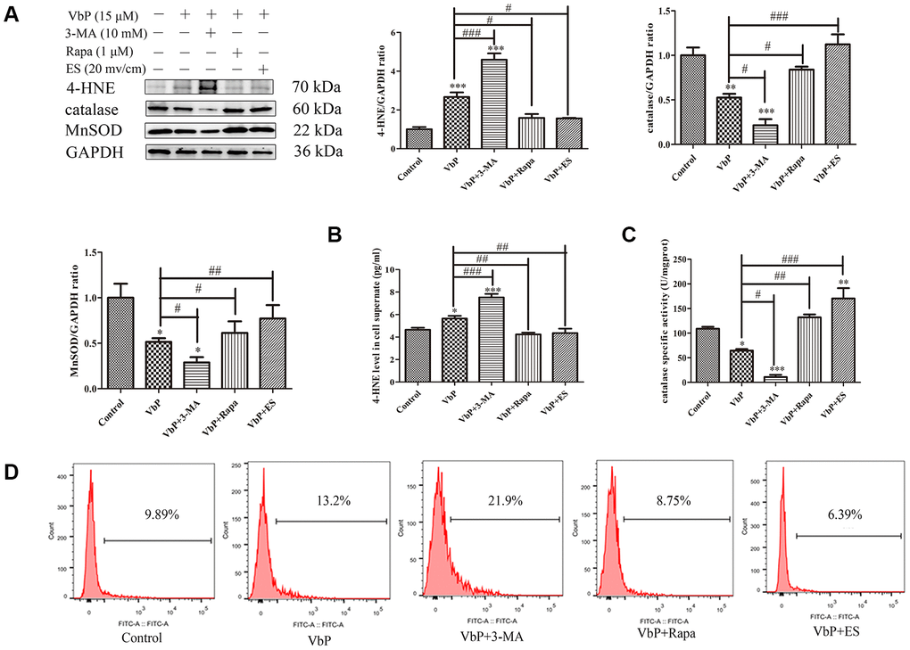 We further assessed whether ES could attenuate or reverse VbP-induced oxidative stress by analyzing the expression of 4-hydroxynonenal (4-HNE) protein adducts, indicative of lipid peroxidation, as well as two key antioxidant enzymes, i.e. catalase and MnSOD. As shown in Figure 6A, 4-HNE adduct levels were increased significantly by VbP exposure, further augmented by co-administration of 3-MA, and attenuated by pre-treatment with the autophagy inducer rapamycin (Rapa) and/or subsequent ES. On the other hand, both catalase and MnSOD expression was reduced by VbP, further decreased by co-treatment with 3-MA, and increased by co-incubation with Rapa or exposure to ES. In addition, ELISA showed that the expression of 4-HNE was increased in culture supernatants from VbP-treated cells, further augmented by 3-MA addition, and similarly attenuated by either Rapa or ES (Figure 6B). We also assessed catalase activity through a colorimetric assay, and detected changes in enzyme activity that reflected the corresponding protein expression changes described above (Figure 6C). Finally, ROS production measured by DC-FH-DA flow cytometry proved that ROS generation in VbP-treated THP-1 macrophages decreased after treatment with Rapa or ES, and increased instead after co-application of 3-MA (Figure 6D).