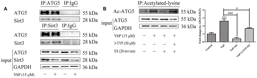 macrophages, however, expression of the Sirt3-ATG5 complex did not change appreciably in response to VbP (Figure 7A). Based on these observations, we next sought to understand whether ATG5 was a substrate for Sirt3. By using an antibody directed against acetyl-lysine residues to immunoprecipitate ATG5, we demonstrated that ATG5 acetylation increased in response to VbP, decreased after subsequent ES, and was also reduced, but remained above basal levels, after pre-treatment with 3-TYP (Figure 7B). These data suggest that ES promotes Sirt3-mediated deacetylation of ATG5, leading to autophagosome formation in VbP-treated macrophages.