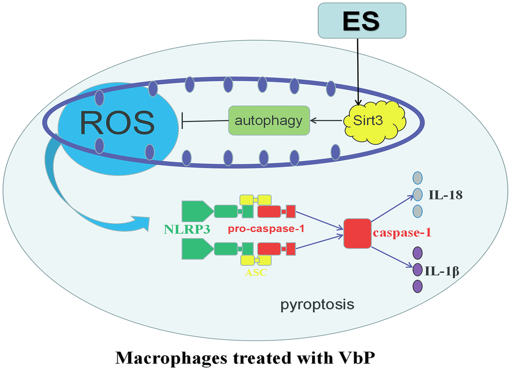 The present work explored whether ES can inhibit oxidative stress and reduce the production of ROS by up-regulating Sirt3 and enhancing autophagy, and then reducing the occurrence of VbP -induced pyroptosis in THP-1 macrophages.