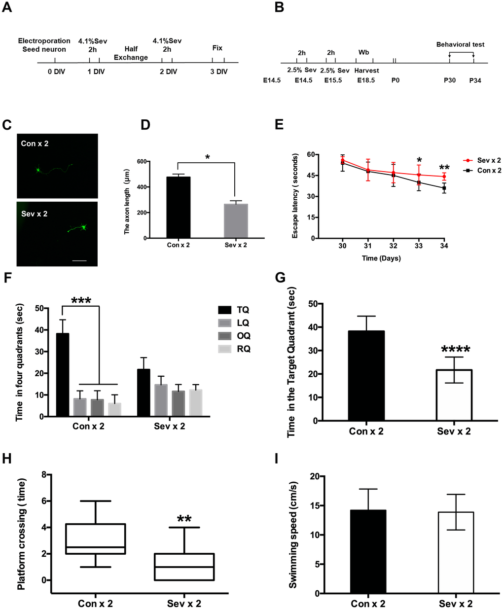 Cognitive functions in young mice were assessed in the Morris Water Maze (MWM) test, which was used to measure spatial memory from P30 to P34. Escape latency is a major indicator of the capacity for spatial learning, while reference memory function is assessed in the probe trial [25]. Two-way ANOVA with repeated measurements showed a significant interaction between anesthesia exposure (sevoflurane versus control) and time (P30 to P34). Dual sevoflurane exposure induced cognitive impairment, as evidenced on P33, by increasing escape latency (Figure 1E, P = 0.028, N=10, Student’s t-test). During the probe trial (P34), escape latency was also increased in the dual sevoflurane exposure group (Figure 1E, P = 0.007, N=10, Student’s t-test). Mice in the control group also spent more time in the target quadrant during the probe trial (P34) (Figure 1F, P < 0.001, N = 10, one-way ANOVA), while sevoflurane group mice spent nearly equal amounts of time all four quadrants. Moreover, sevoflurane group mice spent significantly less time in the target quadrant than control group mice (Figure 1G, P < 0.0001, N = 10, Student’s t-test). In addition, platform crossing time also differed between the sevoflurane and control groups (Figure 1H, P = 0.0033, N=10, Student’s t-test). Swimming speed, however, was similar between the two groups (Figure 1I, P = 0.7721, N=10, Student’s t-test).