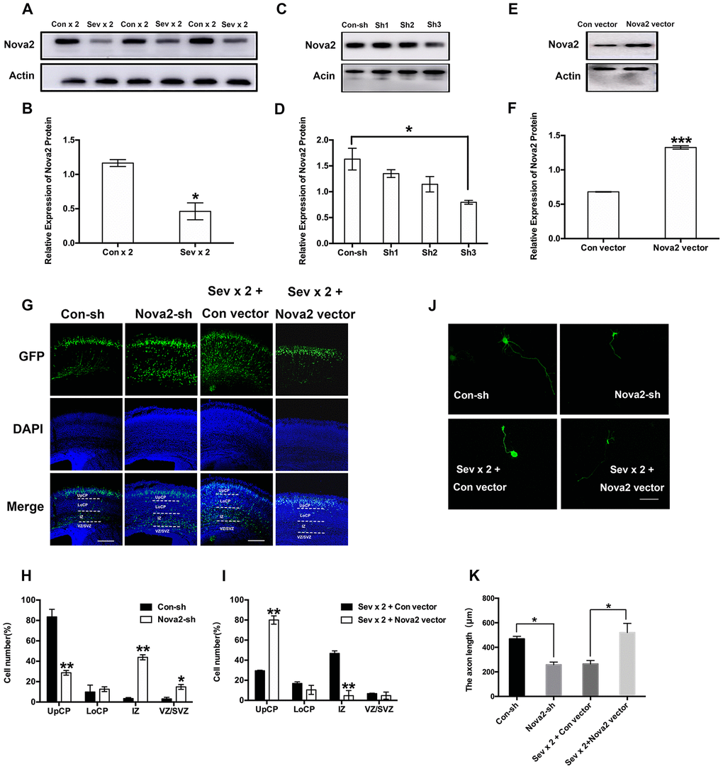 To further study the role of Nova2 in neural development, we designed a series of shRNAs against the mouse Nova2 gene and Nova2 vectors. We identified one set of shRNAs that significantly decreased Nova2 protein levels (Figure 2C, 2D, P = 0.0146, N = 3, one-way ANOVA) and a Nova2 vector that significantly overexpressed Nova2 (Figure 2E, 2F, P = 0.0007, N = 3, Student’s t-test) in mouse primary cortical neurons. We then investigated the role of Nova2 in neuronal migration using in utero electroporation. Plasmids encoding GFP were injected together with Nova2 shRNA into the lateral ventricle. Interestingly, Nova2 knockdown strongly repressed neuronal migration in the fetal brain (Figure 2G and 2H). Compared to the Con-sh group, the Nova2-sh group had significantly larger fractions of neurons in the intermediate zone (IZ) (43.86 ± 2.49%, P = 0.0021, N = 3, Student’s t-test) and ventricular zone (VZ)/subventricular zone (SVZ) of the cortex (14.84 ± 2.4%, P = 0.0283, N = 3, Student’s t-test), and a significantly smaller fraction of neurons in the upper cortical plate (UpCP) (28.68 ± 2.2768%, P = 0.0098, N = 3, Student’s t-test), further indicating that changes in Nova2 protein can interfere with proper neuronal migration. Next, we conducted rescue assays to confirm the role of Nova2 in neuronal migration. Overexpression (OE) of Nova2 successfully reversed loss of function; Nova2 OE neurons exhibited phenotypes similar to those of neurons that only expressed the con vector (Figures 2G and 2I) and were primarily located within the UpCP (80.015 ± 4.1507%, P = 0.0034, N = 3, Student’s t-test). In addition, Nova2 knockdown inhibited axons growth to a similar degree as dual sevoflurane exposure (Figure 2J and 2K, P = 0.0106, Student’s t-test), while Nova2 overexpression reversed dual sevoflurane-induced axon growth deficits (Figures 2J and 2K, P = 0.0439, Student’s t-test).