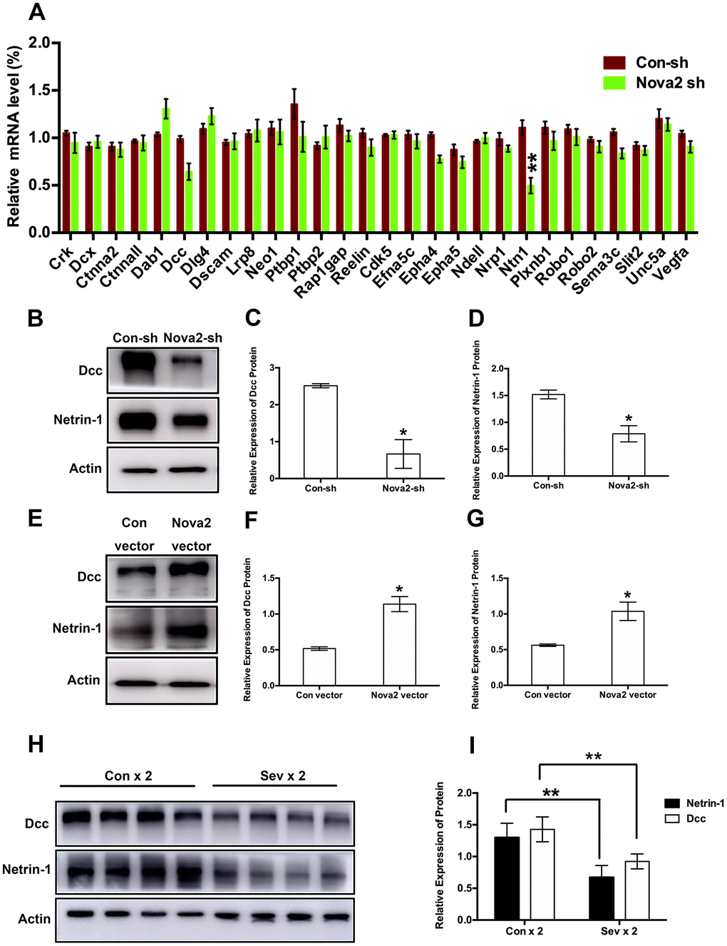 To examine the mechanisms underlying sevoflurane-induced neurotoxicity, we conducted a literature search to identify downstream targets of Nova2 that were significantly enriched in sevoflurane-induced neurotoxicity models. In utero electroporation was used to induce uptake of shRNA constructs that resulted in acute Nova2 knockdown in the developing mouse embryo cortex. Of the 28 candidate genes examined in this experiment, Nova2 knockdown decreased Netrin-1 (Ntn1) mRNA expression (Figure 3A, P = 0.0015, Student’s t-test). Netrin-1, also known as Ntn1, a ligand for the Deleted in Colorectal Cancer (Dcc) receptor belonging to the laminin-related Netrin family of secreted factors, was first identified as a guidance cue for migrating neuronal progenitors and axons in vertebrate’s nervous system development [22]. Dcc, an Ig family receptor, contains a cytoplasmic region with three conserved domains, namely P1, P2, and P3. Despite advances in the study of Netrin-1/Dcc signaling, little is known about how the intracellular Dcc signaling complex is organized or about associated cellular signal transduction mechanisms. Several recent in vitro studies indicate that the Nova2 may regulate alternative Dcc splicing during neuronal migration and axon guidance in the spinal cord [21]. However, there is no direct evidence of a relationship between Nova2 and the Netrin-1/Dcc receptor. It is therefore unclear whether and how Netrin-1/Dcc acts as a downstream effector of Nova2 signaling. First, we examined the effects of Nova2 expression on Dcc and Netrin-1 protein levels in the fetal brain. Western blotting revealed that Nova2 knockdown (Nova2 shRNA) suppressed Dcc and Netrin-1 expression (Figure 3B, Figure 3C (P = 0.0217, N = 3, Student’s t-test), Figure 3D (P = 0.0264, N = 3, Student’s t-test)), while overexpression of Nova2 (Nova2 vector) upregulated Dcc and Netrin-1 levels (Figure 3E–3G, Figure 3F (P = 0.0148, N = 3, Student’s t-test), Figure 3G (P = 0.0353, N = 3, Student’s t-test)). Furthermore, Nova2 directly interacted with Netrin-1/Dcc in the cerebral cortex (Supplementary Figure 3). We then explored whether dual sevoflurane exposure affected the expression of these two proteins. Indeed, levels of both proteins were also decreased in the neonatal brain after dual sevoflurane exposure in the second trimester (Figure 3H, 3I). Although previous studies have shown that Nova2 deficiency may disrupt Netrin-induced ventral projection to the midline and axon outgrowth [21], there is no evidence that Netrin-1/Dcc have adverse effects on neuronal migration or axon length during neonatal brain development. We therefore developed a set of shRNAs that significantly decreased Dcc protein (Figure 4A and 4B, F = 10.57, P = 0.0226, N = 3, one-way ANOVA) and Netrin-1 protein (Figure 4C and 4D, F = 7.084, P = 0.0445, N = 3, one-way ANOVA) levels. We demonstrated for the first time that Netrin-1/Dcc knockdown similarly inhibited neuronal migration and axon length (Figure 4E–4H). Finally, we found that Netrin-1/Dcc knockdown mitigated the Nova2-induced reversal of deficits in neuronal migration after dual sevoflurane exposure (Figure 5A, 5B).