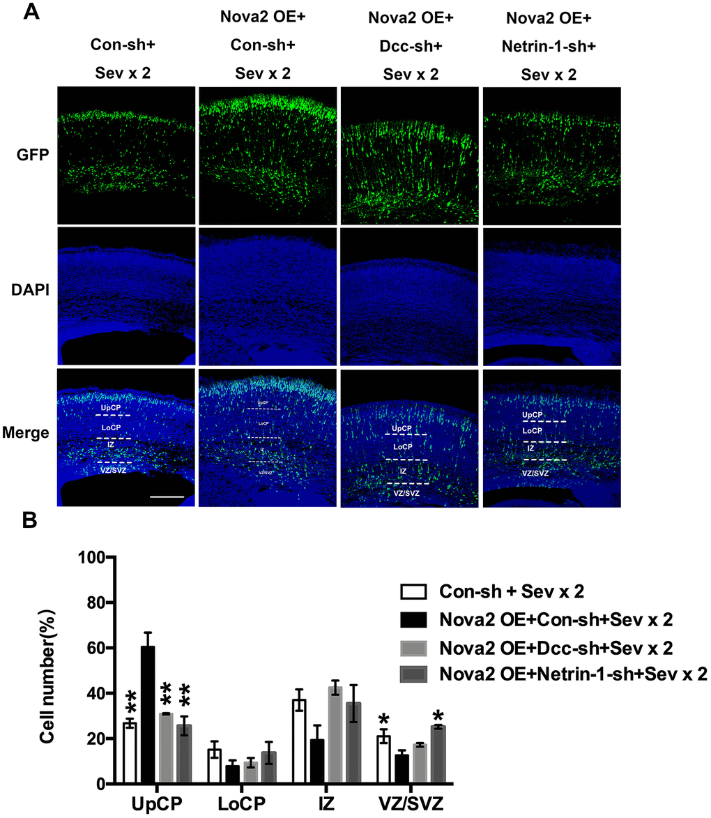 Nevertheless, the mechanisms by which Nova2 proteins suppress neuronal migration remain unclear. Previous studies have reported significant changes in Dcc exon 17 in Nova2-/- mice [13]. Dcc plays various roles in the nervous system, including modulating dendritic growth and guidance [32–35] and synapse formation and function [36–38]. Consistent with previous studies, we found that Dcc protein levels decreased when Nova2 expression was inhibited. Interestingly, we demonstrated that Netrin-1 protein levels decreased dramatically as well. Netrins are a family of proteins that direct cell and axon migration during development. Receptors for secreted netrins include Dcc and the UNC5 homologs in mammals. Dcc mediates chemo-attraction, while repulsion requires a UNC5 homolog. Netrin-1-Dcc signaling is required to stimulate commissural axon outgrowth and to attract axons to the ventral midline [21]. When comparing the effects of Netrin-1/Dcc knockdown and Nova2 knockdown, we found that knockdown of either Netrin-1 or Dcc increased numbers of GFP+ neurons within the SVZ/VZ and IZ similarly to Nova2 knockdown. Additionally, as was the case for Nova2, knockdown of either Netrin-1 or Dcc reduced axon lengths (Figure 4). CO-IP suggested that Nova2/Netrin-1/Dcc may exert their effects by forming a complex. While knockdown of all three factors results in similar defects in neuronal migration, axon outgrowth, and axon guidance, whether these defects are temporary or persist for a long time remains unknown. Nova2 proteins may also play a part in other pathological processes, such as abnormal methylation or alteration of synaptic properties [39]. Moreover, Dcc alternative splicing is perturbed by Nova2 deficiency in vivo [21], and alternative splicing might therefore be involved in sevoflurane-induced deficits in neuronal development. Finally, Nova2 proteins might also have various other biochemical effects, including alternative mRNA polyadenylation [14] and functional regulation of Argonaute-microRNA complexes [40]. Further studies are necessary to fully characterize the role of Nova2 during neural development.