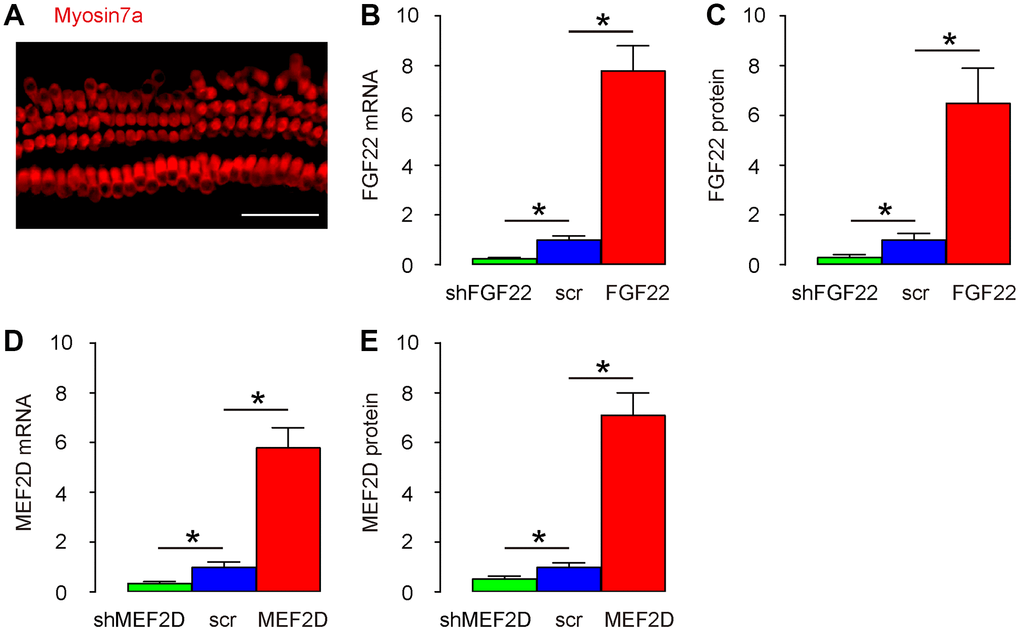Mouse hair cells were isolated and kept in culture and their structure was shown after immunostaining for Myosin7a, a specific marker for hair cells, in a representative image (Figure 1A). In order to study the mechanisms by which the FGF22/MEF2D regulates the alteration in ribbon synapses, we generated AAV vectors overexpressing or depleting FGF22 and MEF2D, respectively. First, these viral vectors were validated by transducing cultured hair cells. We found that AAV-FGF22 significantly increased mRNA of FGF22 in hair cells, while AAV-shFGF22 significantly decreased mRNA of FGF22 in hair cells, by RT-qPCR (Figure 1B). Moreover, AAV-FGF22 significantly increased protein of FGF22 in hair cells, while AAV-shFGF22 significantly decreased protein of FGF22 in hair cells, by ELISA (Figure 1C). We also found that AAV-MEF2D significantly increased mRNA of MEF2D in hair cells, while AAV-shMEF2D significantly decreased mRNA of MEF2D in hair cells, by RT-qPCR (Figure 1D). AAV-MEF2D significantly increased protein of MEF2D in hair cells, while AAV-shMEF2D significantly decreased protein of MEF2D in hair cells, by ELISA (Figure 1E). Thus, these FGF22/MEF2D-modulating AAVs faithfully altered the FGF22/MEF2D levels in mouse hair cells.