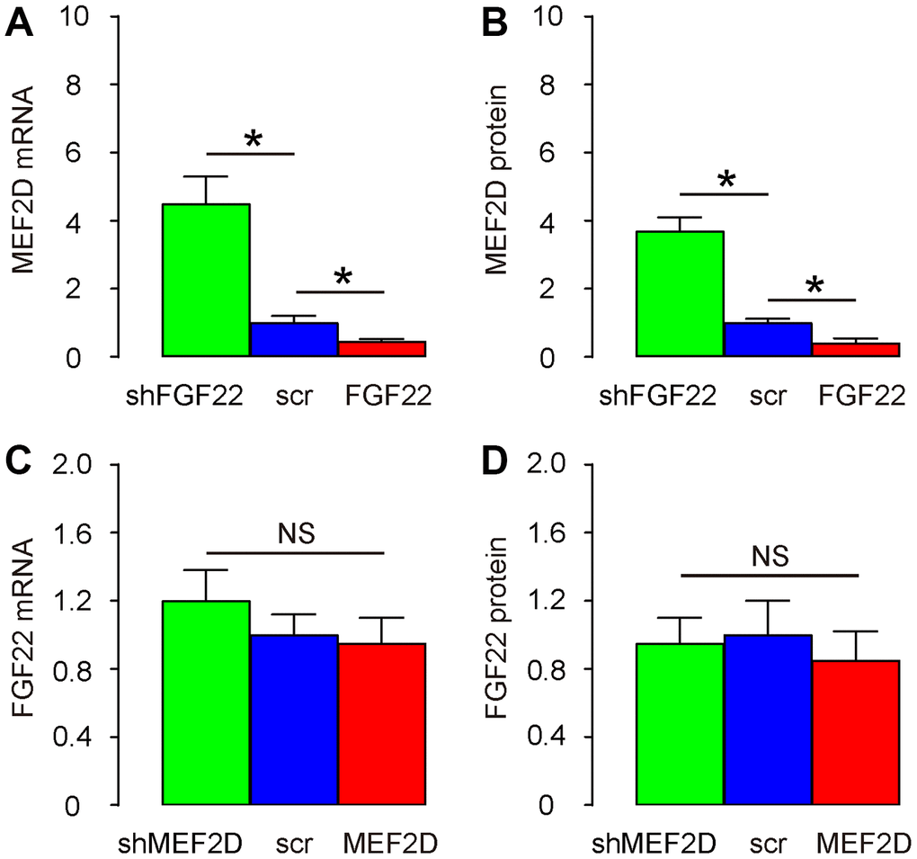 Next, we examined the regulatory relationship between FGF22 and MEF2D. We found that AAV-FGF22 significantly decreased mRNA of MEF2D in hair cells, while AAV-shFGF22 significantly increased mRNA of MEF2D in hair cells, by RT-qPCR (Figure 2A). Moreover, AAV-FGF22 significantly decreased protein of MEF2D in hair cells, while AAV-shFGF22 significantly increased protein of MEF2D in hair cells, by ELISA (Figure 2B). Thus, FGF22 suppresses MEF2D in the cultured mouse hair cells. On the other hand, neither AAV-MEF2D nor AAV-shMEF2D significantly altered mRNA (Figure 2C) or protein (Figure 2D) of FGF22 in hair cells, suggesting that MEF2D does not regulate FGF22 in the cultured mouse hair cells. Hence, FGF22 is the upstream regulator for MEF2D, but not vice versa.
