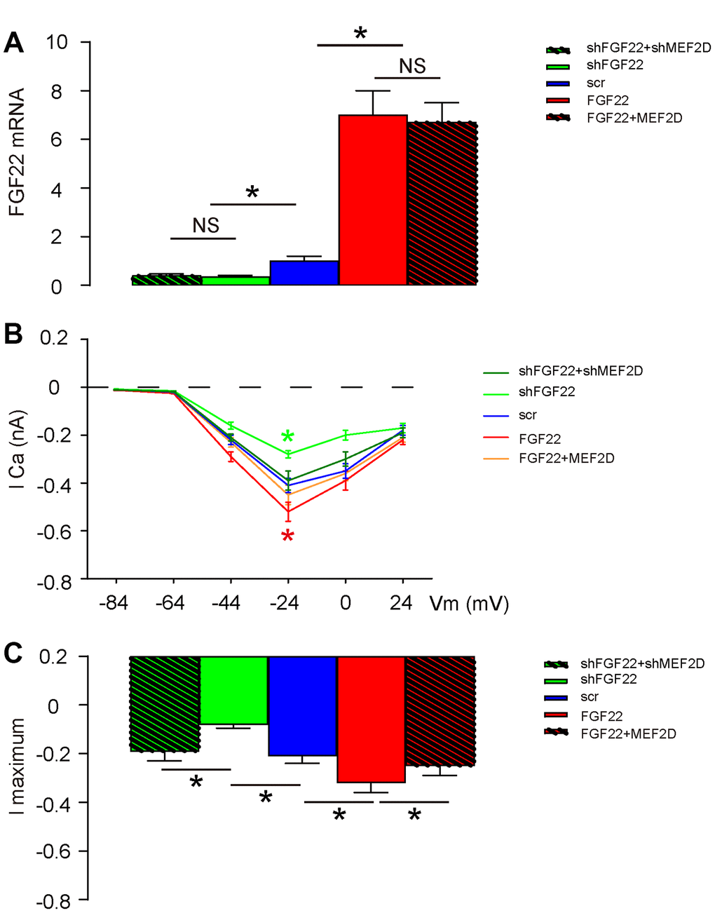 Previous studies have shown that FGF22 regulates calcium currency in cells to drive exocytosis [13, 14], and calcium has been shown as a suppressor for MEF2 [15]. Thus, we hypothesized that FGF22 may inhibit MEF2D through increases in calcium influx. To prove it, we measured the hair cell voltage-gated calcium current in AAV-FGF22- or AAV-shFGF22-transduced hair cells. AAV-MEF2D was also co-transduced with AAV-FGF22, while AAV-shMEF2D was also co-transduced with AAV-shFGF22, aiming to abolish the effects of FGF22 modulation on MEF2D. First, we confirmed that alteration of FGF22 levels by FGF22-AAVs was not affected by co-transduction with MEF2D-AAVs (Figure 3A). Next, we measured current-voltage in these transduced cells. We found that overexpression of FGF22 significantly increased calcium currency in cells, which was completely abolished by co-expression of MEF2D, while of depletion of FGF22 significantly decreased calcium currency in cells, which was completely abolished by co-expression of shMEF2D (Figure 3B–3C). These data suggest that FGF22 indeed increases calcium influx in the cultured mouse hair cells.