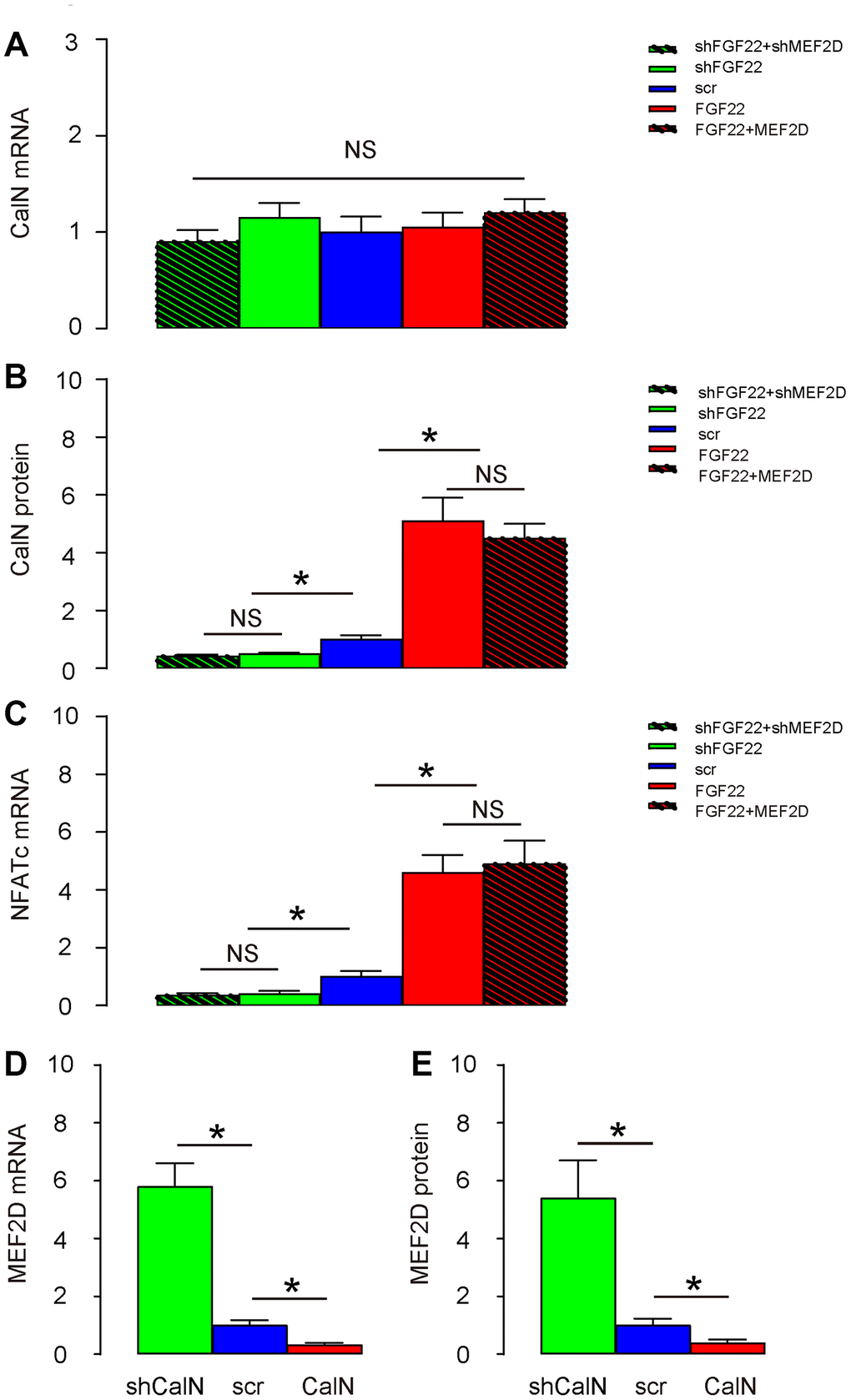 CalN is a calcium-dependent serine/threonine protein phosphatase. Increased calcium influx activates CalN by binding a regulatory subunit of nuclear factor of activated T cell cytoplasmic (NFATc), and then CalN induces transcription factors (NFATc) to mediate multiple functions, including suppression of MEF2 [16, 17]. Thus, we examined the expression of CalN in these conditions. While CalN mRNA remained unaltered in hair cells transduced with these 5 different combinations of AAVs (Figure 4A), we found that overexpression of FGF22 significantly increased protein levels of CalN and its downstream factor NFATs in cells, both of which were completely abolished by co-expression of MEF2D, while of depletion of FGF22 significantly decreased protein levels of CalN and its downstream factor NFATs in cells, both of which were completely abolished by co-expression of shMEF2D (Figure 4B, 4C), suggesting that FGF22-induced calcium influx activates CalN in mouse hair cells. In order to find out whether CalN by itself regulates MEF2D, we generated CalN-modulating AAVs to transduce hair cells. We found that AAV-CalN significantly decreased mRNA of MEF2D in hair cells, while AAV-shCalN significantly increased mRNA of MEF2D in hair cells, by RT-qPCR (Figure 4D). Moreover, AAV-CalN significantly decreased protein of MEF2D in hair cells, while AAV-shCalN significantly increased protein of MEF2D in hair cells, by ELISA (Figure 4E). Together, these data suggest that FGF22-induced calcium influx activates CalN to inhibit MEF2D in mouse hair cells.