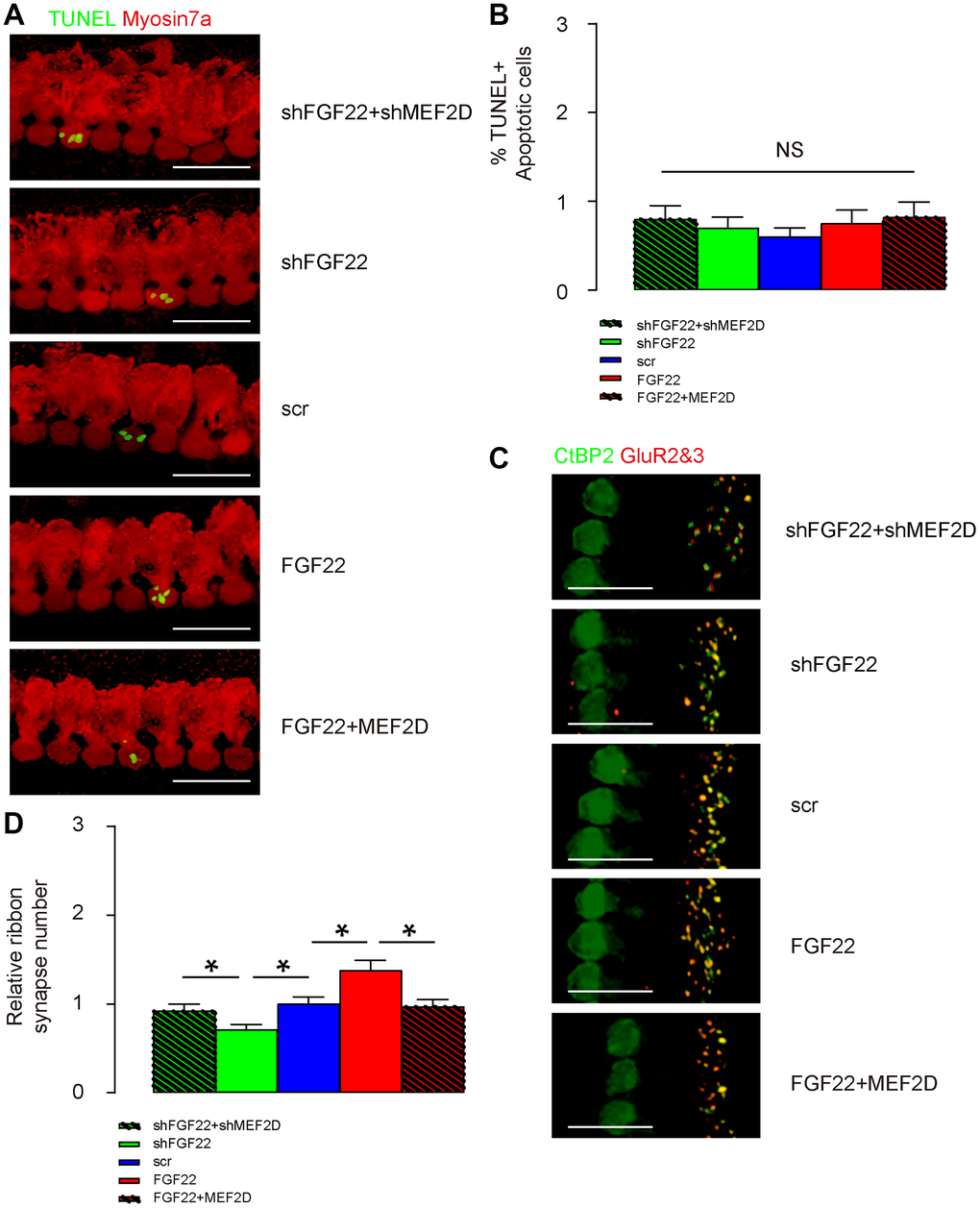 AAV-shFGF22 and AAV-FGF22 were administrated to mouse cochlea to deplete or overexpress FGF22 in hair cells, respectively. Co-administration of AAV-shMEF2D with AAV-shFGF22 or co-administration of AAV-MEF2D with AAV-FGF22 was also performed to assess the regulatory relationship between FGF22 and MEF2D in hair cells and ribbon synapses. First, TUNEL staining was performed on cochlea, showing no alteration in cell apoptosis by either AAV combinations, shown by representative images (Figure 5A), and by quantification (Figure 5B). Thus, FGF22/MEF2D does not regulate hair cell apoptosis. The ribbon synapses were determined by immunopositivity for presynaptic membrane marker CtBP2 and postsynaptic membrane marker GluR2&3. We found that overexpression of FGF22 significantly increased the ribbon synapse number in cochlea, which was completely abolished by co-expression of MEF2D, while of depletion of FGF22 significantly decreased ribbon synapse number in cochlea, which was completely abolished by co-expression of shMEF2D, shown by representative images (Figure 5C), and by quantification (Figure 5D). These data suggest that FGF22 depletion reduces ribbon synapse number in vivo.