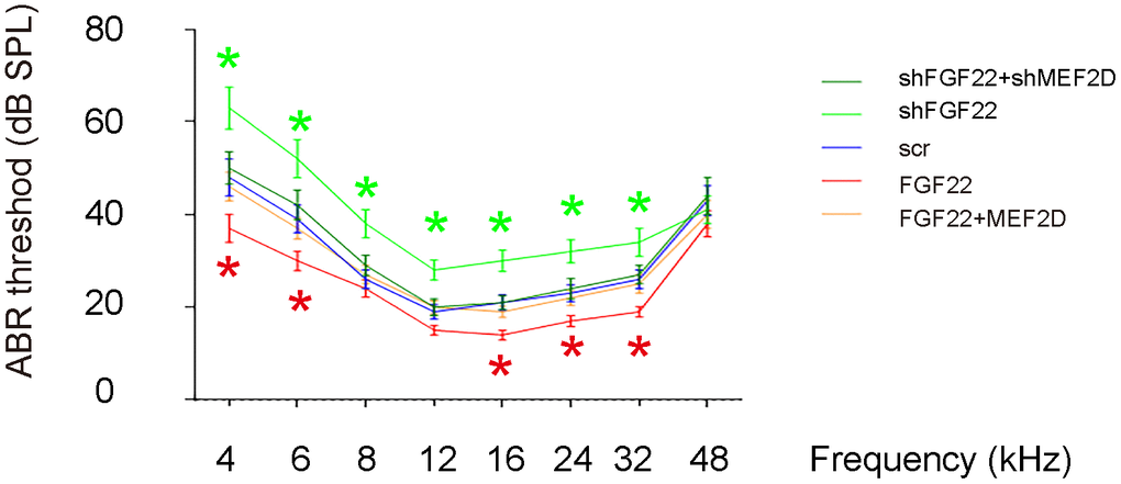 Next, we assessed the effects on ABR threshold of the mice. ABR threshold was identified as the stimulus intensity required to evoke a voltage response 5x the root mean square (RMS) noise floor for the measurement. We found that overexpression of FGF22 significantly reduced the ABR threshold, which was completely abolished by co-expression of MEF2D, while of depletion of FGF22 significantly increased the ABR threshold, which was completely abolished by co-expression of shMEF2D (Figure 6). These data suggest that FGF22 depletion induces elevation of ABR threshold. Our study was thus summarized in a schematic (Figure 7).