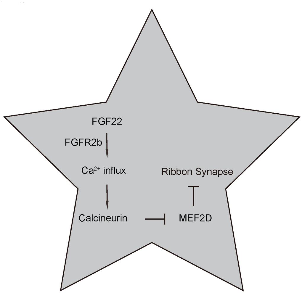 In the current study, we used a set of gain-of-function or loss-of-function experiments, to further demonstrate the regulatory axis of FGF22 and MEF2D in the integrity and mass maintenance of ribbon synapses. First, we showed the regulatory direction is from FGF22 to MEF2D but not vice vista. Hence, the MEF2D is downstream of FGF22. Of note, MEF2 reduction in hippocampal neurons was found to be associated with increases in number of glutamatergic synapses, and overexpression of MEF2 reduced excitatory synapse number [18]. In granule neurons of the cerebellum, MEF2 suppressed differentiation of postsynaptic dendritic claws [19]. To the best of our knowledge, our studies are the first to demonstrate a role of MEF2D in the control of ribbon synapse number. Since the ability of MEF2 to regulate synapse number in other neuronal types is dependent on calcium signaling pathways [18, 19], we performed analysis on calcium influx and CalN. We found that CalN was not only the target factor to be activated by FGF22-mediated calcium influx, but also the suppressor of MEF2D expression. Our data showed that the activation of CalN by FGF22-mediated calcium influx was not at transcription level, which was consistent with the role of calcium as a co-factor for activation and function of CalN [13, 14]. On the other hand, CalN inhibited MER2D at both transcriptional and translational levels, which was consistent with previous reports [16, 17].