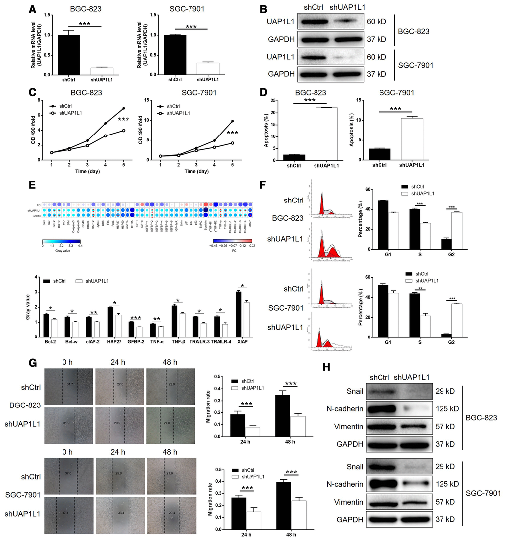 In order to explore the role played by UAP1L1 in the development and progression of gastric cancer, lentiviruses expressing shRNA targeting UAP1L1 (shUAP1L1) or shCtrl (as negative control) were prepared and used to knockdown the expression of UAP1L1 in BGC-823 and SGC-7901 cells with a transfection efficiency of >80% (Supplementary Figure 1). As shown in Figure 2A, the mRNA level of UAP1L1 was decreased by 81.0% (P < 0.001) and 69.2% (P < 0.001) in BGC-823 and SGC-7901 cells, respectively. The depletion of UAP1L1 was also verified by detecting its protein level in BGC-823 and SGC-7901 cells by western blotting (Figure 2B). Next, it was demonstrated that gastric cancer cells with downregulated expression of UAP1L1 (shUAP1L1) exhibited significantly slower proliferation rate than the shCtrl group (P < 0.001, Figure 2C). In consistent, the apoptotic cell percentage in BGC-823 and SGC-7901 cells with UAP1L1 knockdown was 8.9-fold and 3.7-fold higher than the cell transfected with shCtrl (P < 0.001, Figure 2D). Subsequently, a Human Apoptosis Antibody Array was performed on SGC-7901 cells with or without UAP1L1 to manifest the regulatory effects of UAP1L1 knockdown on apoptosis-related proteins, which demonstrated the downregulation of Bcl-2, Bcl-w, clAP-2, HSP27, IGFBP-2, TNF-α, TNF-β, TRAILR-3, TRAILR-4 and XIAP (P < 0.05, Supplementary Figure 2A and 2E). Moreover, the detection of cell cycle distribution clarified that knockdown of UAP1L1 induced the arrest of cell cycle in G2 phase and decreased the percentage of cells in S phase (P < 0.01, Figure 2F), by which may UAP1L1 promotes cell proliferation and cell apoptosis. Otherwise, the results of wound-healing assay showed the significantly suppressed cell migration ability of BGC-823 and SGC-7901 cells in shUAP1L1 group (P < 0.001, Figure 2G), which was further rationalized by the downregulated expression of EMT-related proteins including Snail, N-cadherin and Vimentin, as well as upregulation of E-cadherin and ZO-1 (Figure 2H and Supplementary Figure 2B). Collectively, the in vitro studies clearly validated that UAP1L1 plays an important role in the development and progression of gastric cancer.