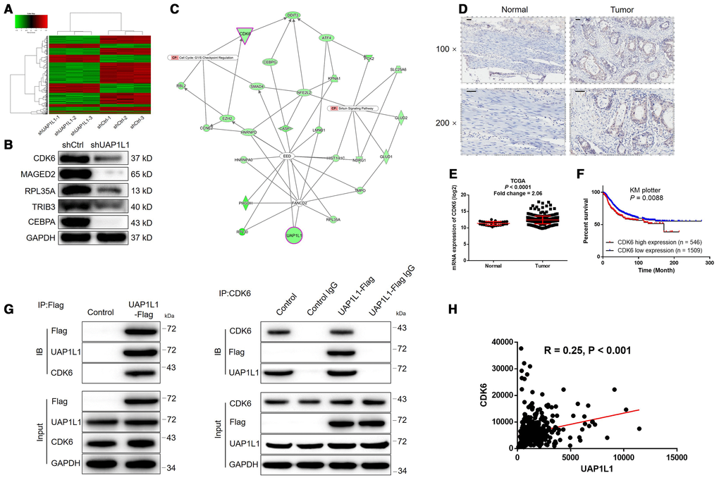 Given the clear-cut role of UAP1L1 in the development of gastric cancer, we next explored the downstream mechanism of its regulatory effects on gastric cancer. A PrimeView Human Gene Expression Array was performed to identify the differentially expressed genes (DEGs) between shUAP1L1 and shCtrl groups of SGC-7901 cells. Totally 610 DEGs were identified based on the threshold of absolute fold change > 2 and FDR < 0.05, among which 200 DEGs were upregulated, and the other 410 DEGs were downregulated in shUAP1L1 group (Figure 3A, Supplementary Figure 3A, 3B). Subsequently, all the DEGs were enriched in canonical signaling pathway and IPA disease and function by IPA analysis (Supplementary Figure 3C, 3D, Supplementary Figure 4 showed the significantly enriched glioma signaling which includes CDK6). Combining all the above results, 20 DEGs were selected for qPCR detection in SGC-7901 cells (Supplementary Figure 3E) and 5 of them were subjected to western blotting for further verification (Figure 3B), indicating the downregulation of CDK6 in UAP1L1 knockdown cells. Subsequently, high-content screening in which cells were infected with lentivirus expressing corresponding shRNAs showed that knockdown of CDK6 significantly inhibited SGC-7901 cell proliferation (Supplementary Figure 5A, 5B). The IPA analysis of UAP1L1 associated interaction network also illustrate the potential linkage of UAP1L1 and CDK6 (Figure 3C). IHC analysis (Figure 3D) and TCGA data mining (P < 0.0001, Figure 3E) were simultaneously performed to detect CDK6 expression in gastric cancer tissues and compared with that in normal tissues, both showing the upregulated expression of CDK6 in gastric cancer. As shown in Figure 3F, the prognosis information collected from 2055 gastric cancer patients in KM plotter database constructed the relationship between CDK6 high expression and relatively short survival period (P = 0.0088). More importantly, the direct UAP1L1-CDK6 interaction and positive correlation between them were confirmed by co-IP (Figure 3G) and TCGA data mining (Figure 3H), respectively. Finally, similar with UAP1L1, the expression of CDK6 was found to be significantly higher in gastric cancer cells compared to GES-1 cells (Supplementary Figure 5C).