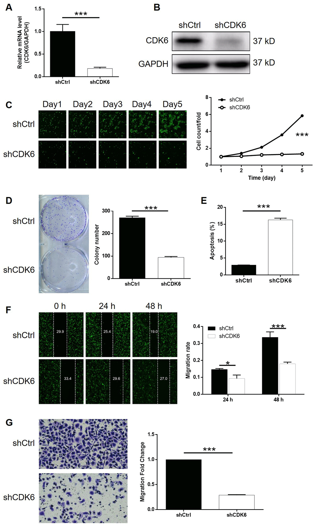 In order to make clear the role of CDK6 in the development of gastric cancer, cytofunctional experiments were conducted using similar methods as mentioned above following the construction of CDK6 knockdown SGC-7901 cells. The transfection and knockdown efficiencies were evaluated by a combination of fluorescence imaging, qPCR and western blotting (P < 0.001, Supplementary Figure 6A, 4A, 4B). The results of Celigo cell counting assay indicated that cell growth of SGC-7901 cell transfected with shCDK6 almost stagnated while that transfected with shCtrl grew normally (P < 0.001, Figure 4C). Moreover, number of colonies formed by the cells was counted after 14 days of culture, displaying a large difference between shCDK6 (less) and shCtrl (more) groups (P < 0.001, Figure 4D). The effects of CDK6 knockdown on cell apoptosis and cell cycle were also proved to be similar with UAP1L1 knockdown, which increased apoptotic cell percentage in shCDK6 group by approximate 6-fold (P < 0.001, Figure 4E) and significantly induced G2 phase arrest (P < 0.001, Supplementary Figure 6B). Finally, a combination of wound-healing assay and Transwell assay distinguished that SGC-7901 cells with CDK6 knockdown suffered from much weaker motility (P < 0.001, Figure 4F, 4G). In summary, CDK6 possessed similar regulatory effects on the development of gastric cancer with UAP1L1.