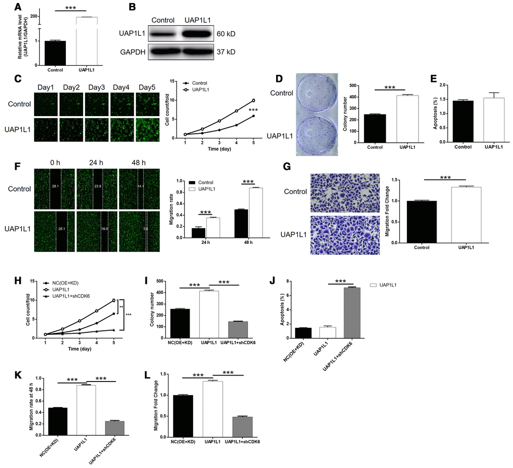 We next constructed SGC-7901 cells with mere UAP1L1 overexpression and simultaneous UAP1L1 overexpression + CDK6 knockdown to investigate the synergistic effects of them on gastric cancer. First of all, the transfection of SGC-7901 cells by UAP1L1 overexpression plasmids (Supplementary Figure 7), as well as upregulation of UAP1L1 (P < 0.001, Figure 5A, 5B), significantly accelerate cell proliferation rate (P < 0.001, Figure 5C). In line with the results of cell proliferation assay, it was also found that UAP1L1 overexpression promoted the formation of colonies (P < 0.001, Figure 5D). Interestingly, we failed to observed the expected inhibition of cell apoptosis, which may be attributed to the low apoptosis rate in the shCtrl group (Figure 5E). Furthermore, UAP1L1 overexpression was shown to be capable of promoting cell motility of SGC-7901 cells based on the detection of wound-healing and Transwell assays (P < 0.001, Figure 5F, 5G). More importantly, the comparison of the results obtained from UAP1L1 group (UAP1L1 overexpression) and UAP1L1+shCDK6 group (UAP1L1 overexpression + CDK6 knockdown) group demonstrated that all the effects on cell proliferation, colony formation, cell apoptosis and cell migration by UAP1L1 overexpression could be alleviated or even reversed by CDK6 knockdown (P < 0.001, Supplementary Figures 7, 8, 5H–5L). In a word, these results clarified the promotion effects of UAP1L1 overexpression on gastric cancer, in which CDK6 may be involved.