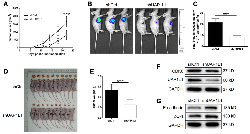 For further verifying the influence of UAP1L1 knockdown on tumor growth in vivo, mice xenograft models were constructed through subcutaneous injection of SGC-7901 cells transfected with shUAP1L1 or shCtrl. The measurement of tumor volume started at day 7 post tumor-inoculation, the results of which illustrated the significantly slower growth rate of tumors formed in shUAP1L1 group (Figure 6A). The final volume (day 22) of tumors formed in shUAP1L1 group was calculated to be approximate 50% smaller than that in shCtrl group (P < 0.001, Figure 6A). On the other hand, the tumor burden of mice in shUAP1L1 and shCtrl groups was also assessed by in vivo imaging facilitated by injection of D-luciferin. The much stronger bioluminescence intensity in mice of shUAP1L1 groups than that of shCtrl group also proved the suppression of tumor growth by UAP1L1 knockdown in vivo (P < 0.001, Figure 6B, 6C). Moreover, the inhibited development of gastric cancer could also be affirmed by directly observing the removed tumors and the significantly lower weight of tumors removed from mice in shUAP1L1 group (P < 0.001, Figure 6D, 6E). Moreover, western blotting demonstrated the downregulated expression of UAP1L1 and CDK6, and upregulated expression of E-cadherin and ZO-1 in tumor tissues collected from shUAP1L1 group (Figure 6F, 6G). Therefore, all the above results strongly confirmed the role of UAP1L1 in the development and progression of gastric cancer in vitro and in vivo.