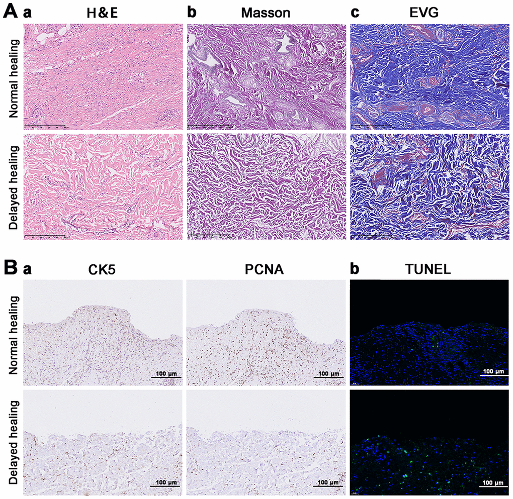 Extracellular matrix components (e.g., fibronectin, elastin, and collagen) are essential for wound repair [26]. The restoration of tissue integrity is the result of neutrophils, monocytes, macrophages, fibroblasts, endothelial cells, and keratinocytes and the scaffold provided by the ECM [7, 27]. We found that tissue from cutaneous wounds with delayed healing had more inflammatory cells compared to tissue from wounds with a normal rate of healing (Figure 1A-a). Masson and EVG staining demonstrated that delayed wound tissue had significantly less assembled collagenous, muscular, and elastic fibers (Figure 1A-b). Re-epithelialization is another essential process in wound healing [28]. IHC staining with the re-epithelialization marker CK5 revealed that re-epithelialization was not complete in the delayed wound tissue, and PCNA expression on the delayed wound tissue surface was decreased compared to normal wound tissue (Figure 1B-a, b). There was also an increased number of apoptotic cells in the delayed wound tissue compared to the normal wound tissue (Figure 1B-c).