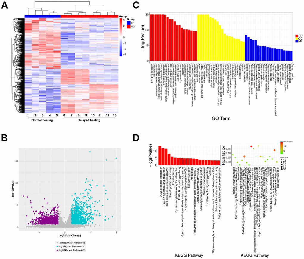 To explore the mechanism of delayed wound healing and re-epithelialization, RNA sequencing with clustering analysis (heatmap and volcano) identified a total of 1792 downregulated genes and 1570 upregulated genes (Figure 2A, 2B). Gene ontology (GO) and KEGG pathway analysis showed that the top 20 enrichment functions included ECM organization, interaction, and cell adhesion (Figure 2C, 2D). These results demonstrated that the assembly of ECM-associated collagenous, muscular, and elastic fibers was weakened, and the re-epithelization process was slowed in tissues with delayed wound healing.