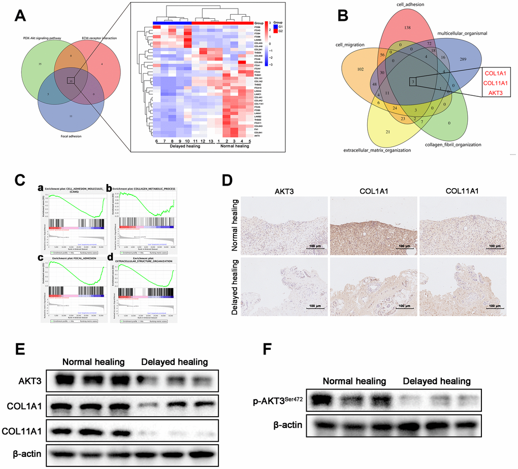 We used next-generation sequencing to further investigate the molecular mechanisms involved in the impaired tissue remodeling observed with delayed cutaneous wound healing. We found that the ECM organization, ECM-receptor interactions, and cell adhesion were enriched. In particular, transcriptome analysis demonstrated that the expression of AKT3, COL1A1, and COL11A1 in delayed wound tissue was downregulated in three tissue remodeling-related processes, including PI3K-AKT signaling, focal adhesion, and ECM-receptor interaction. These changes were confirmed by IHC and western blotting. Based on these results, we asked whether the changes observed in AKT3, COL1A1, and COL11A1 expression were truly linked or just coincidental.