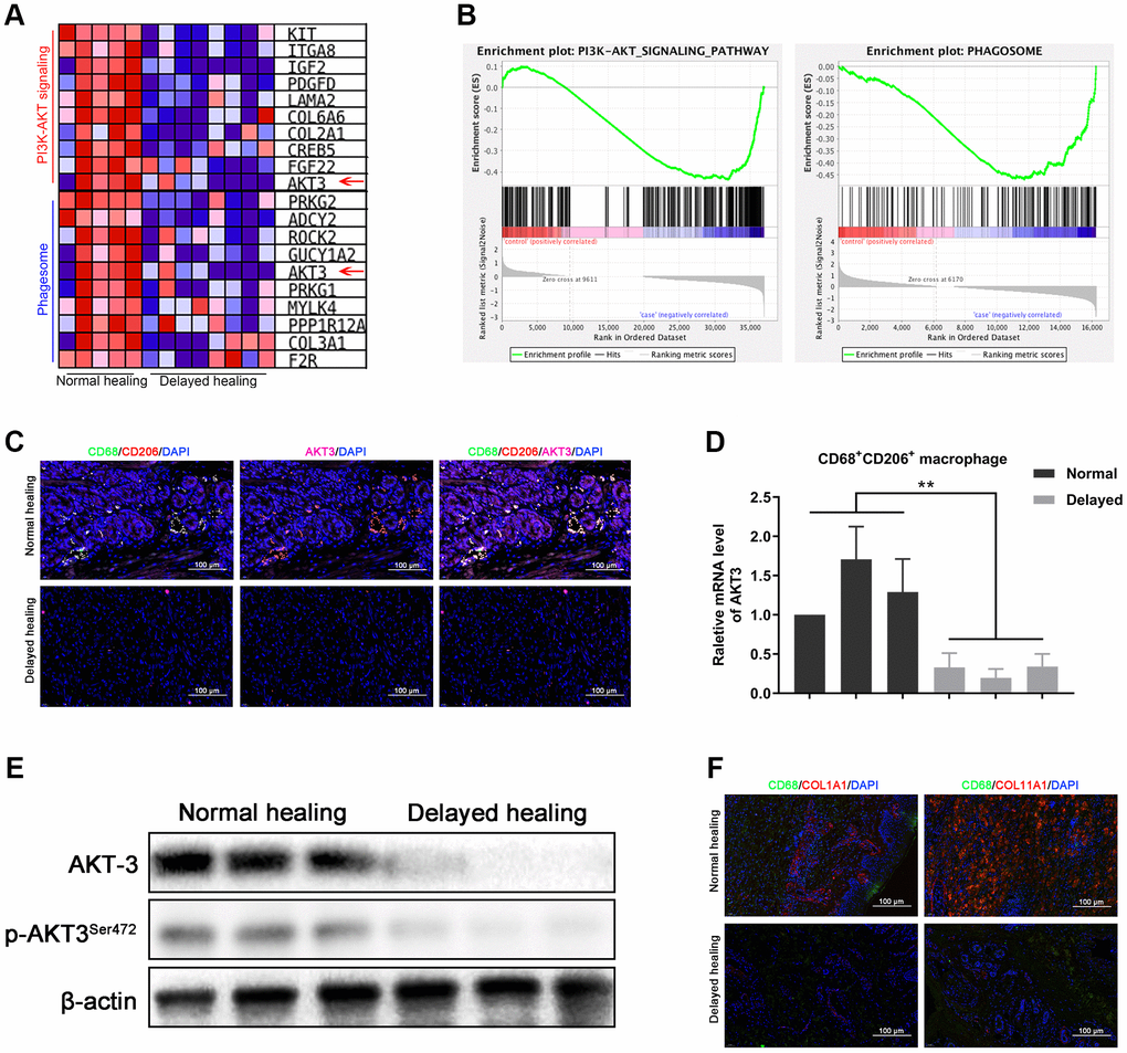 M2 macrophages are crucial for cutaneous wound healing and healing of wounds in other organs [10, 28]. AKT3 deficiency in M2 macrophages is responsible for cholesterol metabolism which was closely corelated to wound repair [25, 31]. We evaluated whether the downregulation of AKT3 was M2 macrophage-specific and responsible for the changes observed in COL1A1 and COL11A1 expression in the delayed wound tissue. GSEA revealed that PI3K-AKT signaling and phagosome-related genes (characteristic of macrophages) were negatively enriched in the delayed wound tissue (Figure 4A). The PI3K-AKT signaling and phagosome-associated heatmaps revealed that AKT3, which was one of the top 10 changed genes, was decreased in both the PI3K-AKT3 signaling and phagosome categories for the delayed wound tissue (Figure 4B).