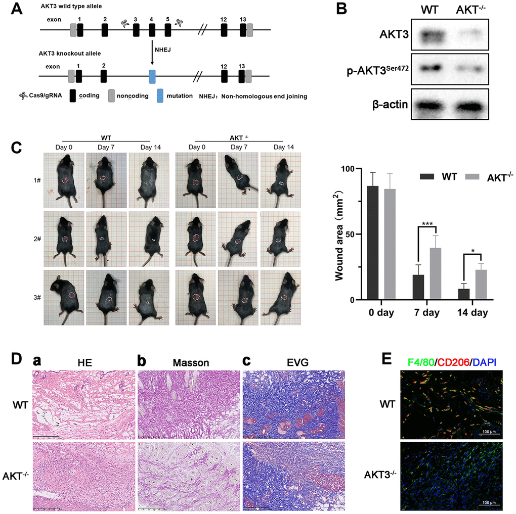 AKT3 knockout mice (AKT3-/-, C57BL/6 background) were generated by Model Organisms (Shanghai, China). Briefly, exons 3 to 5 were deleted from the AKT3-203 transcript using CRISPR/Cas9 technology. The sequence of the guide RNA was 3′-TGAACCAGTCAGACTGAAGA TGG-5′. The AKT3 knockout vector was injected into ES cells, and then the homologous recombination (HR) of ES cells was selected. The HR ES cells were injected into the blastocysts to generate chimera mice. The chimera mice were crossed with AKT3 wild-type mice (AKT3+/+, C57BL/6 background) to obtain the AKT3-/- mouse strain. The cutaneous wound model was established as previously described [51]. Briefly, mice were anesthetized with ketamine/xylazine (100 mg·kg-1, i.p.), and the back skin was shaved and disinfected with an ethanol solution. Full-thickness excisional wounds were created using a 10-mm biopsy punch and left without cover during the wound healing process.