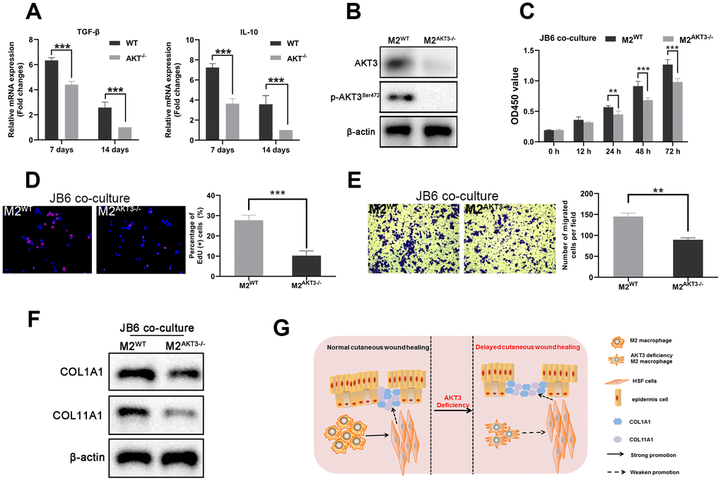 During the tissue remodeling phase of wound healing, we observed that both TGF-β and IL-10 were expressed on days 7 and 14 post-injury, and the levels of expression were lower in the AKT3-/- mice (Figure 7A). AKT3 expression levels in these F4/80/CD206-positive M2 macrophages were also verified by western blotting (Figure 7B). Previous research demonstrated keratinocyte meditated epidermal proliferation was crucial for cutaneous wound healing and was positively regulated by Erk/Akt signaling pathway [33]. To further investigate M2 macrophage to proliferation and migration of mouse JB6 cells, we co-cultured these mouse-derived F4/80/CD206 positive M2 macrophages with the JB6 murine epidermal cell line, results demonstrated that M2 macrophages derived from the wound tissue of AKT3-/- mice lost their ability to promote cell proliferation and migration (Figure 7C–7E). COL1A1 and COL11A1 expression levels were also decreased in the JB6 cells co-cultured with M2 macrophages from the AKT3-/- mice (Figure 7F). Overall, our study demonstrated that decreased M2 macrophage infiltration and impaired function were the underlying causes of delayed cutaneous wound healing. AKT3 deficiency in M2 macrophages appeared to be responsible for this abnormal M2 macrophage infiltration and function.