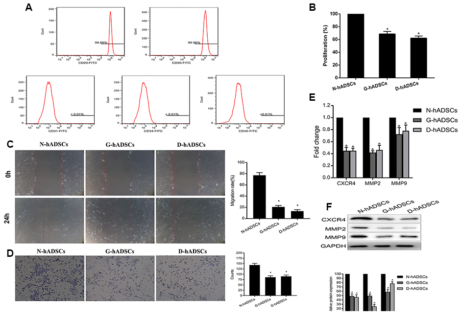 After three passages in culture, the expanded hADSC population became homogeneous, showing the typical shuttle-shape and fibroblast-like adherent cell property. The phenotype of in vitro-cultured hADSCs was characterized by flow cytometry. hADSCs were identified by high expression of CD29 and CD90 but negligible expression of CD31, CD34, and CD45 (Figure 1A). The phenotype, proliferation rate, migration rate, wound healing ability, and relative protein expression of different proteins were characterized for hADSCs that were obtained from non-DM patients (N-hADSCs) and those from DM patients (D-hADSCs) in addition to those cultured in medium containing AGEs in vitro (G-hADSCs). The CCK-8 assay suggested the proliferation of G-hADSCs and D-hADSCs was lower than that of N-hADSCs (Figure 1B). Similarly, G-hADSCs and D-hADSCs had reduced wound healing ability, as detected by the scratch wound assay (Figure 1C) and migration rate across Transwell chambers (Figure 1D) in comparison with N-hADSCs. In accordance with the reduced migration rates observed above, G-hADSCs and D-hADSCs had reduced mRNA and protein expression of migration-related mRNA and proteins including CXCR4, MMP2, and MMP9 compared with N-hADSCs, as detected by RT-qPCR and western blot analysis (Figure 1E and 1F). These results suggested that glucolipotoxicity associated with G-hADSCs and D-hADSCs exerted an inhibitory effect on the proliferation, migration, and wound healing ability of these cells.