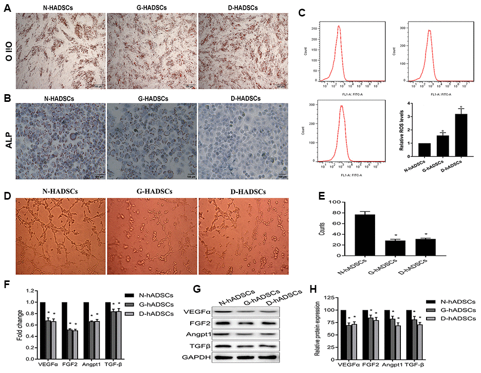To determine the differentiation potential of the three groups of hADSCs (N-hADSCs, G-hADSCs, and D-hADSCs), the ADSCs were cultured under adipogenic or osteogenic induction conditions and stained with Oil-red O and Alizarin Red. The results showed that the osteogenic differentiation potential of G-hADSCs and D-hADSCs was significantly lower than that of N-hADSCs, and the adipogenic differentiation potential of the G-hADSCs and D-hADSCs was significantly higher than that of N-hADSCs (Figure 2A and 2B). Flow cytometry analysis showed a higher ROS level in G-hADSCs and D-hADSCs, which reflected more severe oxidative stress (Figure 2C) in these cells in comparison to N-hADSCs. Furthermore, the angiogenesis potential of these cells was also detected by a HUVEC tube formation assay. The angiogenesis promotion effect of G-hADSCs and D-hADSCs was significantly lower than that of N-hADSCs (Figure 2D and 2E). The mRNA and protein expression of angiogenesis-related genes including VEGFα, FGF2, Angpt1, and TGFβ were also decreased in the G-hADSCs and D-hADSCs compared with that in the N-hADSCs (Figure 2F, 2G, and 2H). Taken together, these results indicated that the glucolipotoxicity environment of G-hADSCs and D-hADSCs decreased their angiogenesis and multipotent differentiation potential in comparison to that of N-hADSCs.