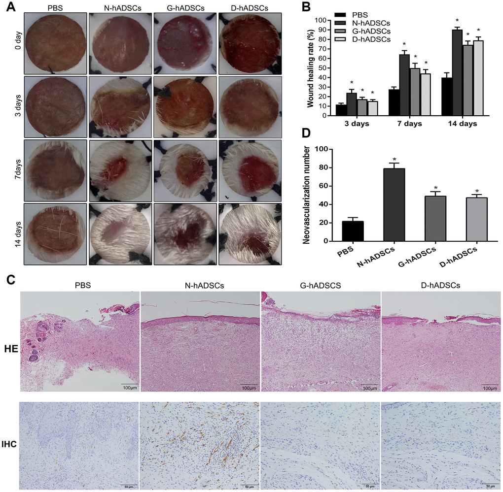 The efficacy of three types of hADSCs (N-hADSCs, G-hADSCs, and D-hADSCs) on wound healing of diabetic rats was investigated. The base of the wound was injected with 5.0 × 106 cells/rat (N-hADSCs, G-hADSCs, or D-hADSCs) and assessed over 14 days. The delivery of all these hADSCs to the wound site accelerated wound healing in rats (Figure 3A). After treatment for 3, 7, and 14 days, the wound sites of diabetic rats were compared and then the diabetic rats were sacrificed. The representative wound images for the four groups (N-hADSCs, D-hADSCs, G-hADSCs, and PBS) were analyzed at different time points. At day 7, the diameter of the skin wound was significantly reduced in the groups that were treated with N-hADSCs, G-hADSCs, or D-hADSCs, but the skin wound diameter of the rats that were treated with N-hADSCs was significantly lower than that of the rats that were treated with G-hADSCs and D-hADSCs. At day 14, the wound diameter of rats treated with G-hADSCs and D-hADSCs was further reduced, but the group treated with N-hADSCs tended to be nearly healed. Histological analysis of the wound bed at day 14 after treatment was performed to further evaluate the tissue structure. The histological observation indicated that the tissue regeneration was better in the rats treated with N-hADSCs, G-hADSCs, and D-hADSCs in comparison to rats treated with PBS. Hematoxylin and eosin (H&E) staining was used to evaluate the wound bed skin sections at day 14 after treatment with different interventions. It showed weak epithelialization, rupture of the dermis, and loose junction of the epidermis and dermis in the PBS group. In the N-hADSCs group, complete epithelialization, thicker dermis, and tight junction of the epidermis and dermis were observed. In the G-hADSCs and D-hADSCs groups, a partially completed epithelialization and thicker dermis were observed. The epithelial layer and skin structure were superior to those of the other three groups. Immunohistochemical staining for wound bed skin sections at day 14 after treatment showed decreased angiogenesis (marked by a decrease of CD31) in G-hADSC and D-hADSC groups compared to the N-hADSC group (Figure 3B). These results indicated that glucolipotoxicity reduced the skin wound treatment ability of G-hADSCs and D-hADSCs.
