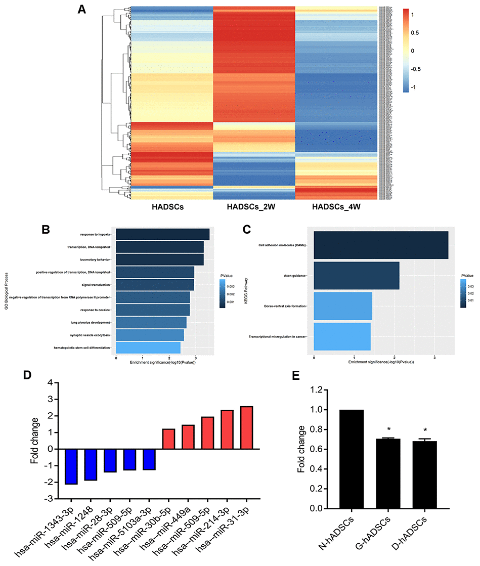 hADSCs were passaged and then cultured in glycosylated media. After 2 and 4 weeks of culturing, cells were isolated to estimate the differential expression of miRNA using high-throughput sequencing. Bioinformatics analysis of the results (Figure 4A) revealed that there were five miRNAs continuously down-regulated at week 2 and 4. GO and KEGG analyses were performed on miRNAs that were down-regulated (Figure 4B and 4C). Then, we performed RT-qPCR of five miRNAs that were up-regulated and five miRNAs were down-regulated based on the miRNA high-throughput sequencing results for further verification, and miR-1248 was chose to the further study (Figure 4D). RT-qPCR of miR-1248 in N-hADSCs, G-hADSCs, and D-hADSCs suggested that its relative expression in G-hADSCs and D-hADSCs was significantly reduced in comparison to that in N-hADSCs (P < 0.05, Figure 4E).
