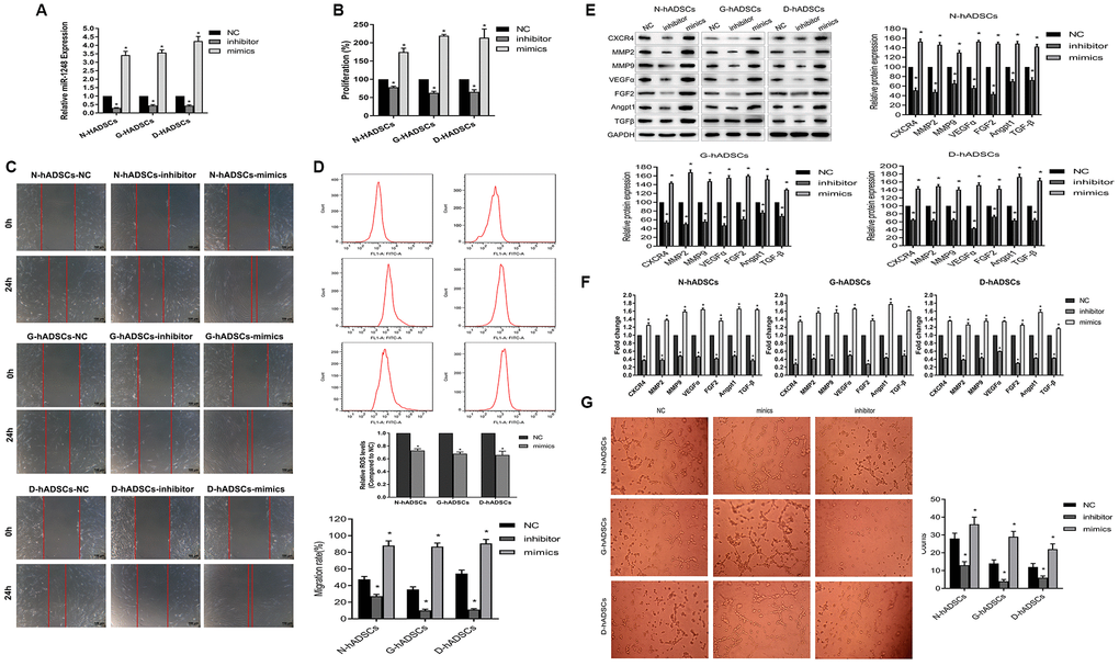 We used miR-1248 mimics and inhibitor to identify the effect of miR-1248 on hADSCs under normal or glucolipotoxic conditions. MiR-1248 mimics or inhibitors were transfected into N-hADSCs, G-hADSCs, and D-hADSCs, and their expression was detected by RT-qPCR (Figure 5A). In the cell proliferation assay, miR-1248 inhibitor suppressed the proliferative ability of hADSCs from different groups but miR-1248 mimic promoted their proliferative ability (P < 0.05, compared with the NC group, Figure 5B). Accordingly, miR-1248 mimics accelerated and miR-1248 inhibitors decelerated the cell migration ability through Transwell chambers and towards wounded regions in scratch wound assays performed on hADSCs from different groups (Figure 5C). Flow cytometry analysis for oxidative stress suggested that miR-1248 mimics could downregulate ROS levels of hADSCs (Figure 5D). We further examined the effect of miR-1248 on the expression of CXCR4, MMP2, MMP9, VEGFα, FGF2, Angpt1, and TGFβ in hADSCs by transfecting them with miR-1248 mimics and inhibitors. The expression of these mRNAs and proteins was inhibited in miR-1248 inhibitor-transfected hADSCs, while overexpression of miR-1248 led to an increase in the expression of these angiogenesis-related genes in hADSCs (P < 0.05, compared with the NC group, Figure 5E and 5F). In addition, the effect of miR-1248 on tube formation (detected by HUVEC tube formation assay) indicated that miR-1248 overexpression in hADSCs increased the angiogenesis ability of HUVECs, and miR-1248 knockdown in hADSCs decreased its efficiency (Figure 5G). These data together suggested that miR-1248 can regulate the stem cell proliferation and angiogenesis potential of hADSCs.