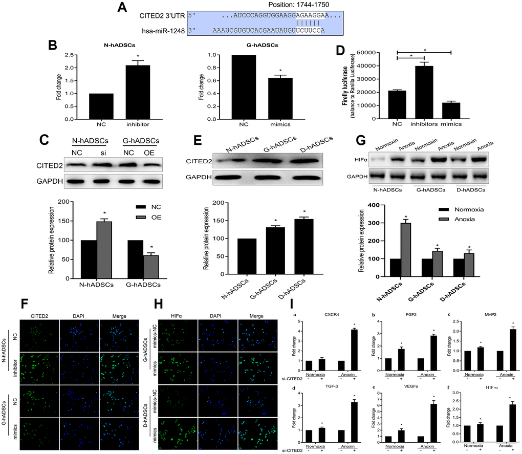 The protein expression of CITED2 was significantly increased in the G-hADSCs and D-hADSCs in comparison to N-hADSCs (P < 0.05, Figure 6E). In addition, we used immunofluorescence to understand the effect of miR-1248 on CITED2 in hADSCs, and the results showed that miR-1248 inhibition in N-hADSCs increased the expression of CITED2 while miR-1248 mimics in G-hADSCs decreased CITED2 expression significantly, similar to the results shown in Figure 6B and 6C (Figure 6F). The protein expression of the HIF-1α was detected in G-hADSCs, D-hADSCs, and N-hADSCs under anoxic or normoxic conditions. The expression of HIF-1α increased under anoxic but decreased under normoxic conditions in the G-hADSCs and D-hADSCs compared to N-hADSCs (Figure 6G). Accordingly, the expression of HIF-1α was detected by immunofluorescence assay and strongly increased when miR-1248 was overexpressed in G-hADSCs and D-hADSCs under the anoxia environment (Figure 6H). Overall, these results indicated that miR-1248 regulated the expression of CITED2 and HIF-1α. In addition, the expression of angiogenesis-related genes (including HIFα, VEGFα, CXCR4, MMP2, FGF2, and TGF-β) was examined in CITED2 knockdown cells. We found that the relative mRNA expression of these six genes was significantly increased in si-CITED2-transfected cells under anoxic conditions (Figure 6I). Taken together, these results indicated that hypoxic conditions led to the inhibition of miR-1248, subsequently increasing CITED2 levels, and repressing CITED2 lead to an increased HIF-1α level in hADSCs.