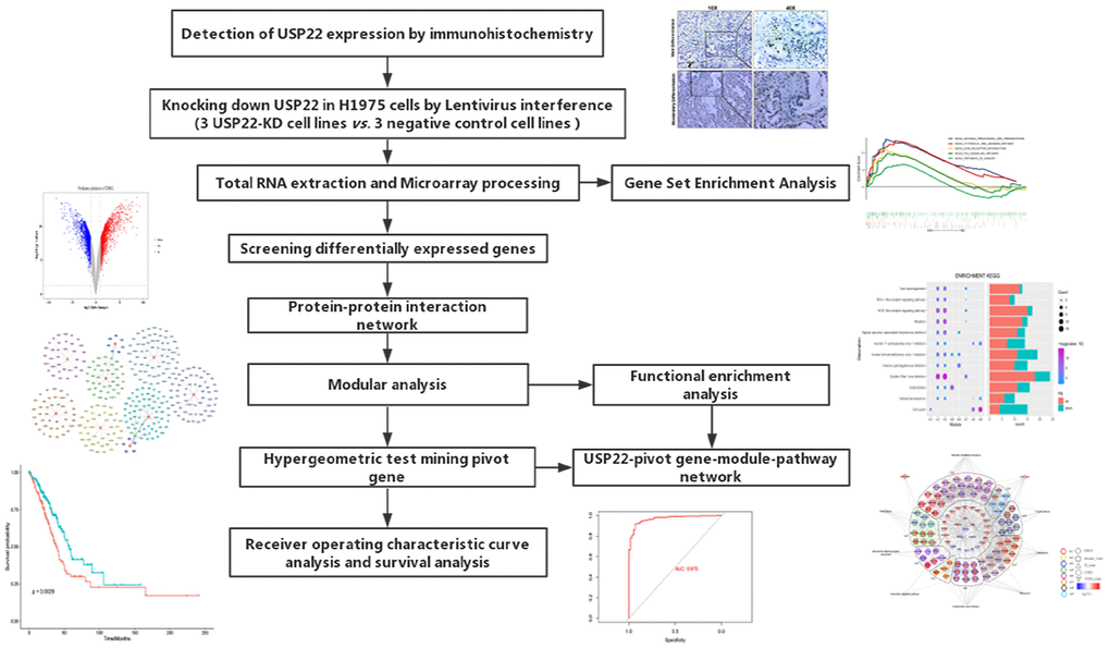 With the development of molecular transcription research, the gene expression has attracted widespread attention to lung cancer research. According to previous studies, high expression of USP22 in LUAD is usually associated with poor prognosis [7]. The workflow of the present study was presented in Figure 1.