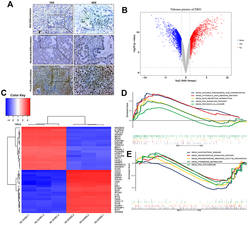 Figure 2. Transcriptional changes of LUAD H1975 cell line induced by knockdown of USP22. (A) Detection of USP22 by immunohistochemistry. (B) Differentially expressed genes in USP22-KD H1975 cells compared to negative control. Red represents up-regulated genes, blue represents down-regulated genes, and gray represents no significantly differentially expressed genes. (C) The expression patterns of these 3806 differentially expressed genes can distinguish between USP22-KD H1975 cells and negative control. (D) Pathways significantly enriched in negative control H1975 cells. (E) Pathways significantly enriched in USP22-KD H1975 cells.