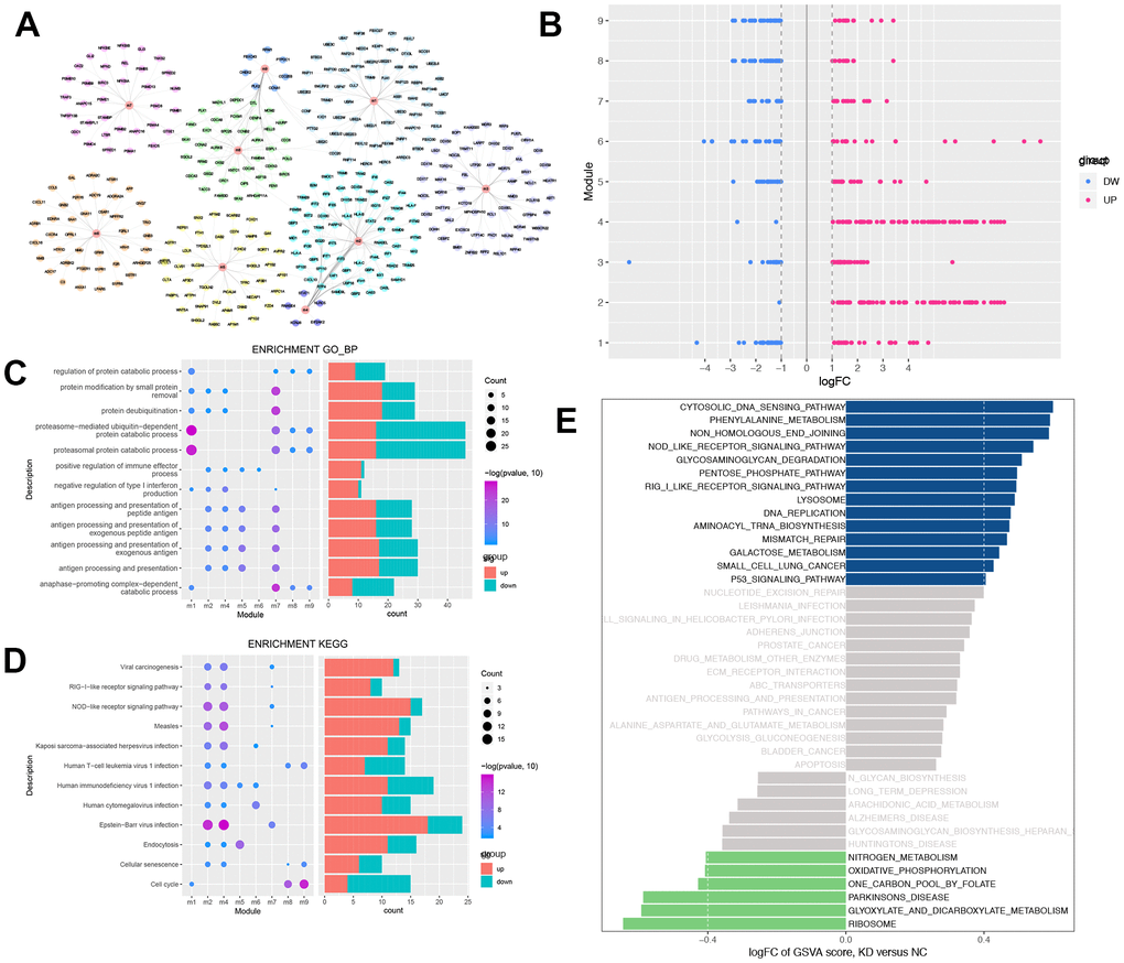 Figure 3. Modular analysis of protein-protein interaction network and functional enrichment analysis. (A) The modules and the module genes, the colors indicated the different modules. (B) Each module contains up-regulated and down-regulated genes. Blue indicates down-regulation of gene expression, while red indicates up-regulation of gene expression. (C) Biological process with more than 3 functional modules significantly enriched in. Blue indicates down-regulation of BPs, while red indicates up-regulation of BPs. (D) KEGG pathways which more than 2 functional modules enriched in. Blue indicates down-regulation of KEGG pathways, while red indicates up-regulation of KEGG pathways. (E) GSEA of KEGG pathway in USP22-KD H1975 cells compared to negative control. LogFC > 0 indicated that the pathway was activated, while logFC < 0 indicated that the pathway was suppressed. Blue indicated the activated pathway was with logFC > 0.4, while green indicated the suppressed pathway was with logFC < -0.4.