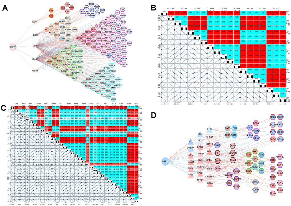 Figure 4. Potential key pivot and transcriptional factors of LUAD regulated by USP22. (A) USP22 regulates multiple modules through pivot genes. (B) The transcription factors correlated with USP22. (C) The transcription factors correlated with its target genes. (D) USP22 regulates multiple modules through transcription factors.