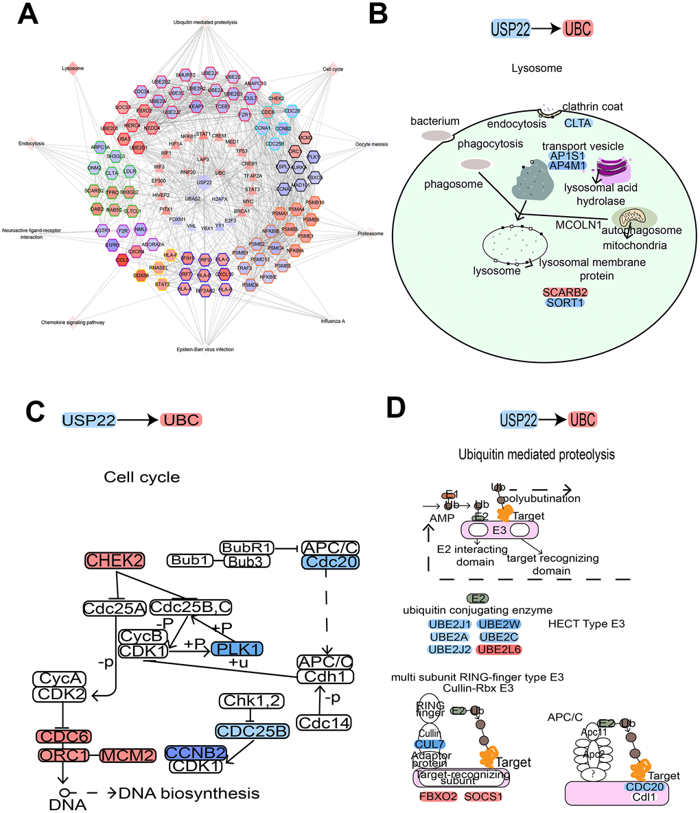 Figure 5. USP22-pivot gene-module-pathway network suggesting USP22 could affect multiple pathways by up-regulating UBC. (A) USP22 regulates the modules by regulating pivot genes in the development of LUAD. (B) Knocking down USP22 up-regulate UBC to result in affecting lysosome pathway. (C) Knocking down USP22 up-regulates UBC to affect cell cycle pathway. (D) Knocking down USP22 could up-regulate UBC to affect the proteolysis pathway mediated by ubiquitin. Blue indicates down-regulated expression, while red indicates up-regulated expression.
