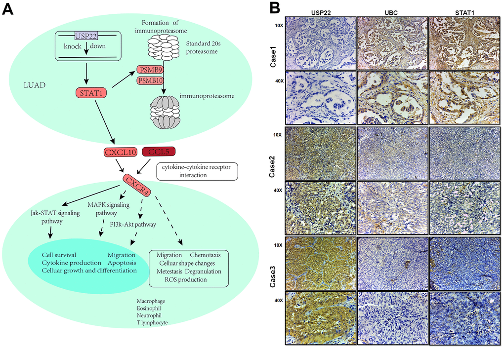 Figure 6. Integrated landscape regulation of STAT1 by USP22-KD. (A) Effect of knocking down USP22 on STAT1 signaling pathway. Blue indicates down-regulated expression, while red indicates up-regulated expression. (B) Detection of USP22, UBC and STAT1 by immunohistochemistry in LUAD.