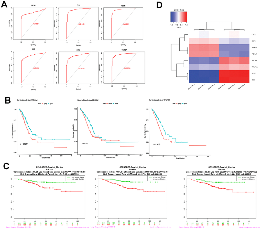 Figure 7. Diagnostic ability and survival curve analysis of transcription factors. (A) ROC curves of 6 genes prove that they have diagnostic ability for LUAD. (B) Survival curves of 3 genes most significantly correlated with LUAD. (C) The effect of 3 genes expression changes on prognosis was verified in GSE31210. (D) Transcription factors differential expression clustering thermogram, the differential expression of these eight pivot genes can be well distinguished USP22-KD H1975 cells and negative control.