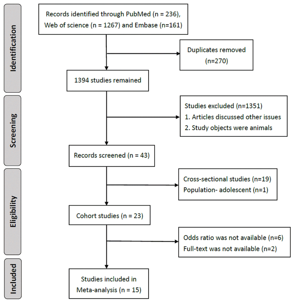 We obtained 1,664 articles through the three research databases. Among the 1,394 articles without duplicate, only 43 discussed the association between physical activity and successful aging. To identify the causal inference of physical activity and successful aging, we excluded 19 cross-sectional studies. Finally, 15 cohort studies were included for analysis (Figure 1).