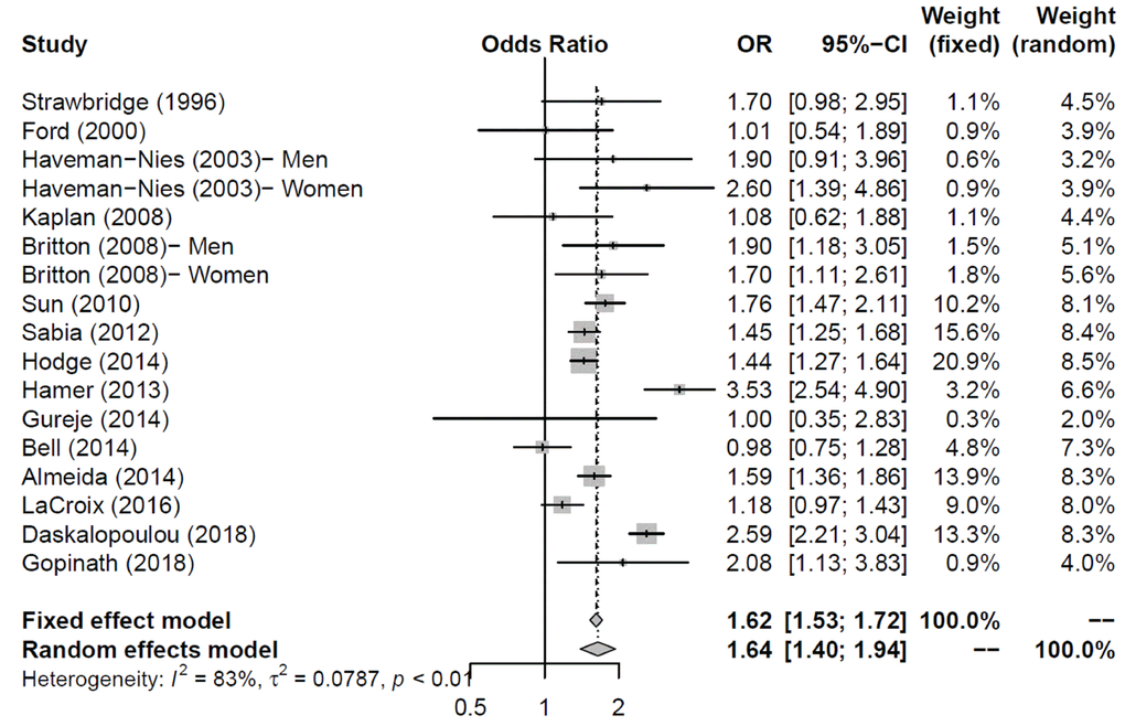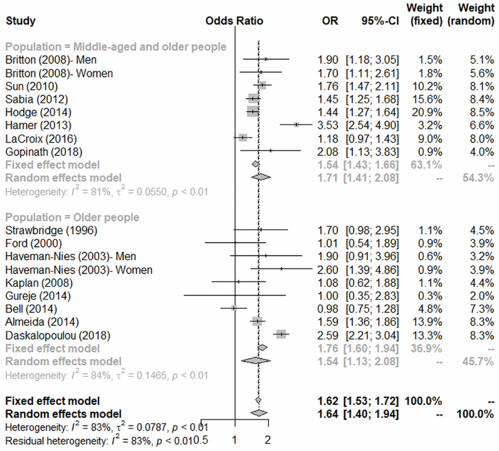 Subgroup analysis (Figure 3) was conducted according to the age group of participants. When all the participants aged >65 years, the effect size became smaller (OR = 1.54, 95% CI = 1.13–2.08). On the contrary, we observed a larger effect in studies in which the recruited participants were a mixture of middle-aged and older adults (OR = 1.71, 95% CI = 1.41–2.08).